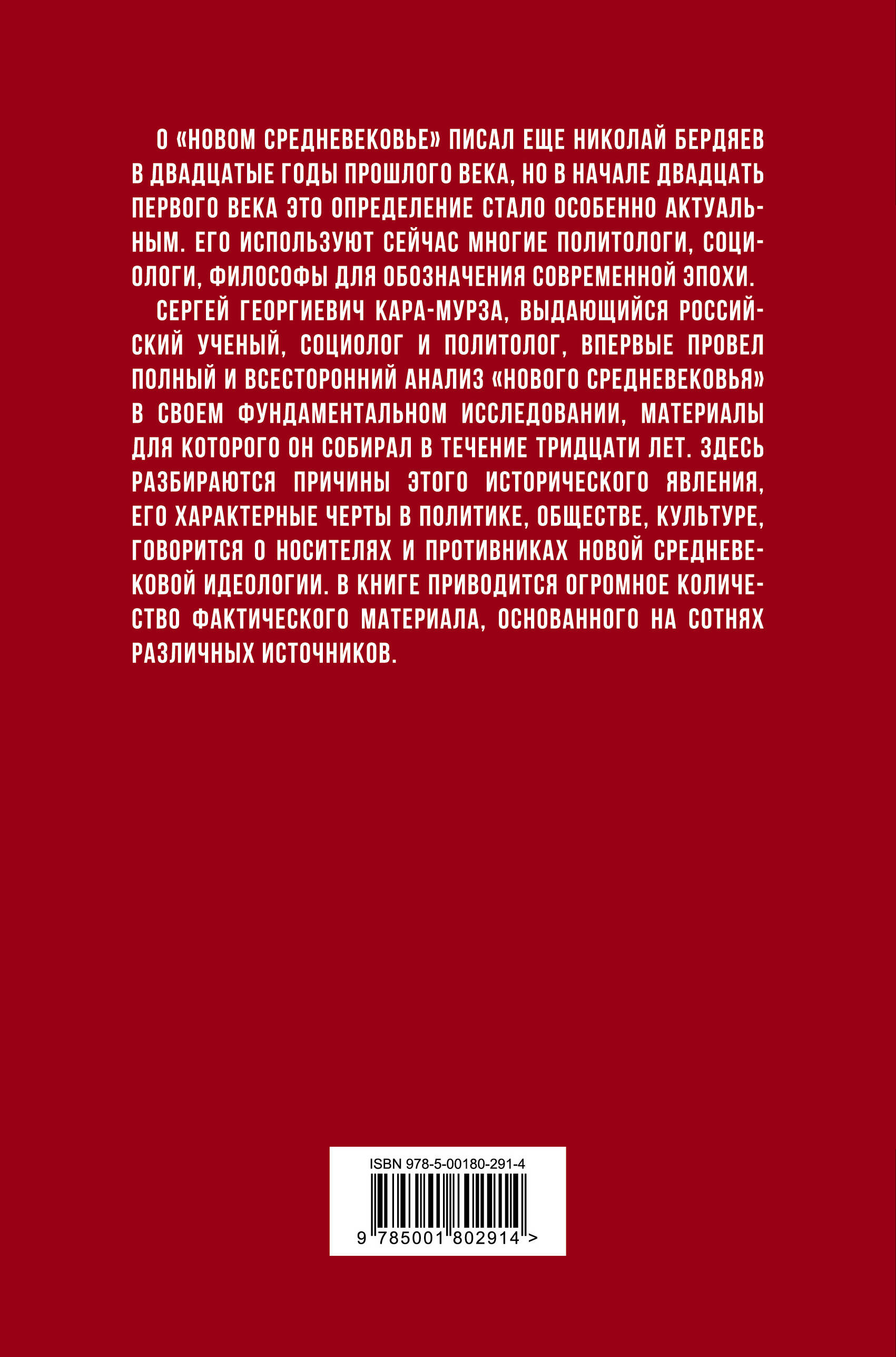 О «новом средневековье» писал еще Николай Бердяев в двадцатые годы прошлого века, но в начале двадцать первого века это определение стало особенно актуальным. Его используют сейчас многие политологи, социологи, философы для обозначения современной эпохи. Сергей Георгиевич Кара-Мурза, выдающийся российский ученый, социолог и политолог, впервые провел полный и всесторонний анализ «нового средневековья» в своем фундаментальном исследовании, материалы для которого он собирал в течение тридцати лет. Здесь разбираются причины этого исторического явления, его характерные черты в политике, обществе, культуре, говорится о носителях и противниках новой средневековой идеологии. В книге приводится огромное количество фактического материала, основанного на сотнях различных источников.| Издательство | Родина Издательство ООО |