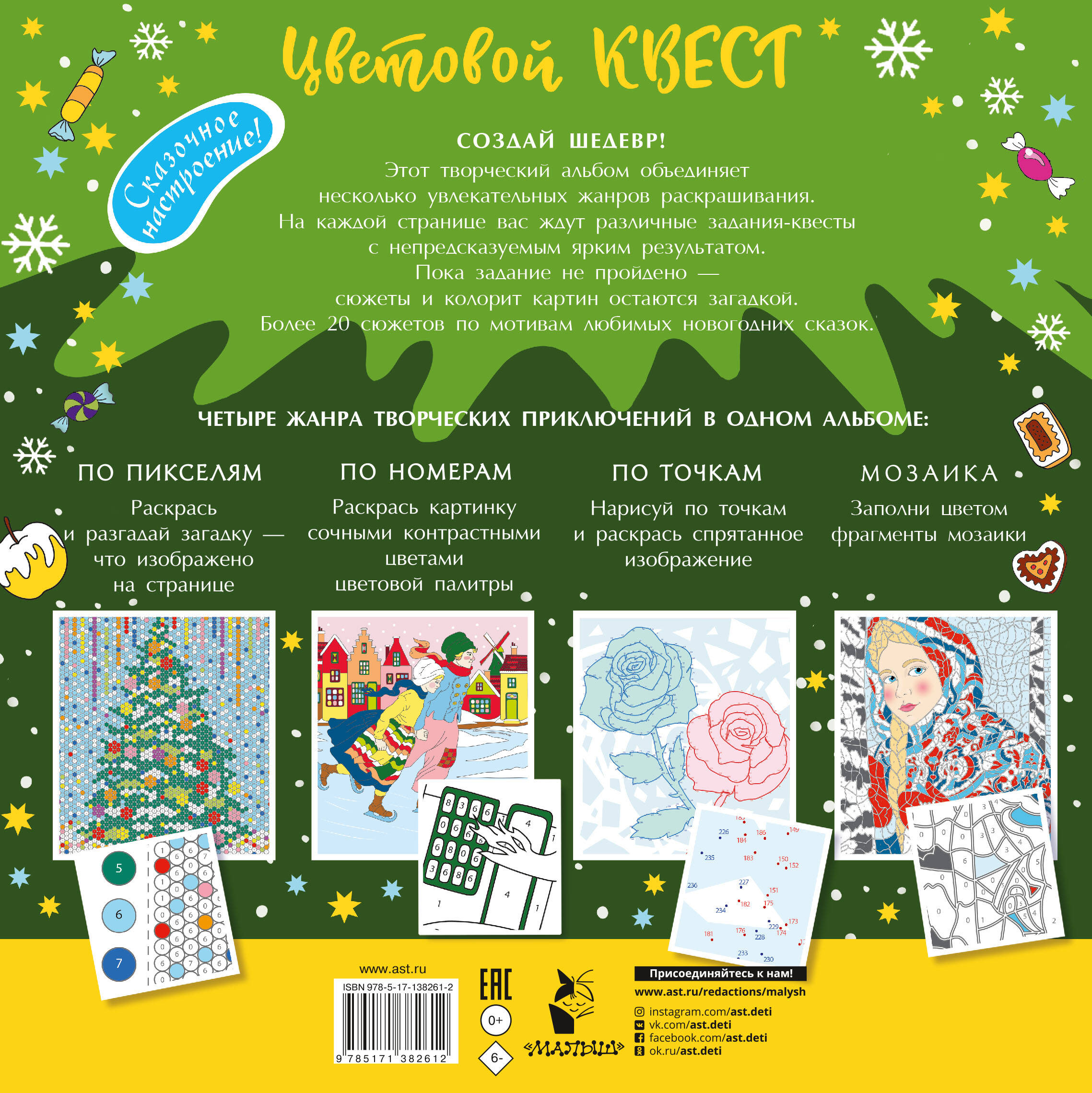 СОЗДАЙ ШЕДЕВР! Этот творческий альбом объединяет несколько увлекательных жанров раскрашивания. На каждой странице вас ждут различные задания-квесты с непредсказуемым ярким результатом. Пока задание не пройдено - сюжеты и колорит картин остаются загадкой. Более 20 сюжетов по мотивам любимых новогодних сказок. ЧЕТЫРЕ ЖАНРА ТВОРЧЕСКИХ ПРИКЛЮЧЕНИЙ В ОДНОМ АЛЬБОМЕ: - ПО ПИКСЕЛЯМ - Раскрась и разгадай загадку - что изображено на странице - ПО НОМЕРАМ - Раскрась картинку сочными контрастными цветами цветовой палитры - ПО ТОЧКАМ - Нарисуй по точкам и раскрась спрятанное изображение - МОЗАИКА - Заполни цветом фрагменты мозаики| Издательство | Издательство "АСТ" |