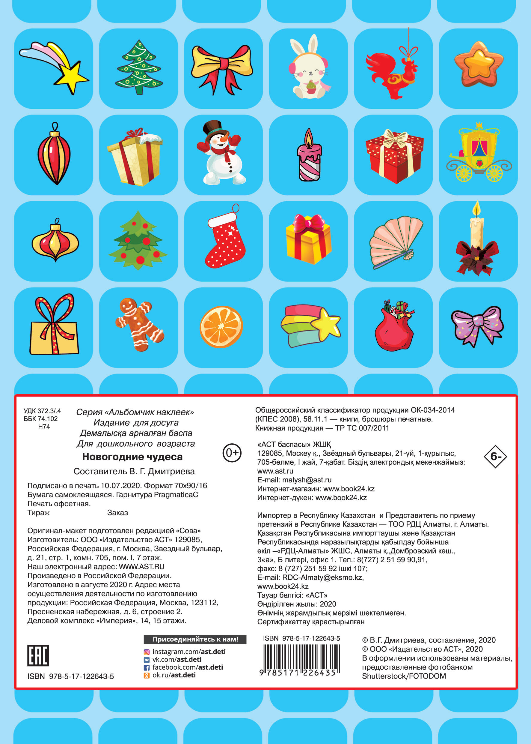 О чем эта книга Чудесный альбомчик наклеек посвящен главному зимнему празднику - Новому году. Кому эта книга будет интересна Коллекция наклеек понравится ребенку, который с нетерпением ждет новогодних каникул и готовит к празднику подарки своими руками. Каковы особенности этой книги Играть с наклейками здорово, весело и очень полезно! Это отличная возможность украсить дом к празднику новогодними поделками. На каждой страничке этой книжки наклеек - подарки, сладости, игрушки и ёлочные украшения. Ребятам обязательно понравится рассматривать странички с яркими стикерами, а еще лучше - создавать праздничные постеры и поделки. Играя с наклейками, малыш сможет сделать для мамы и папы, бабушки и дедушки, а также всех друзей новогодние праздничные сюрпризы. Укрась стикерами открытку Деду Морозу, расскажи о своих мечтах - и чудо обязательно произойдет!| Издательство | Издательство "АСТ" |