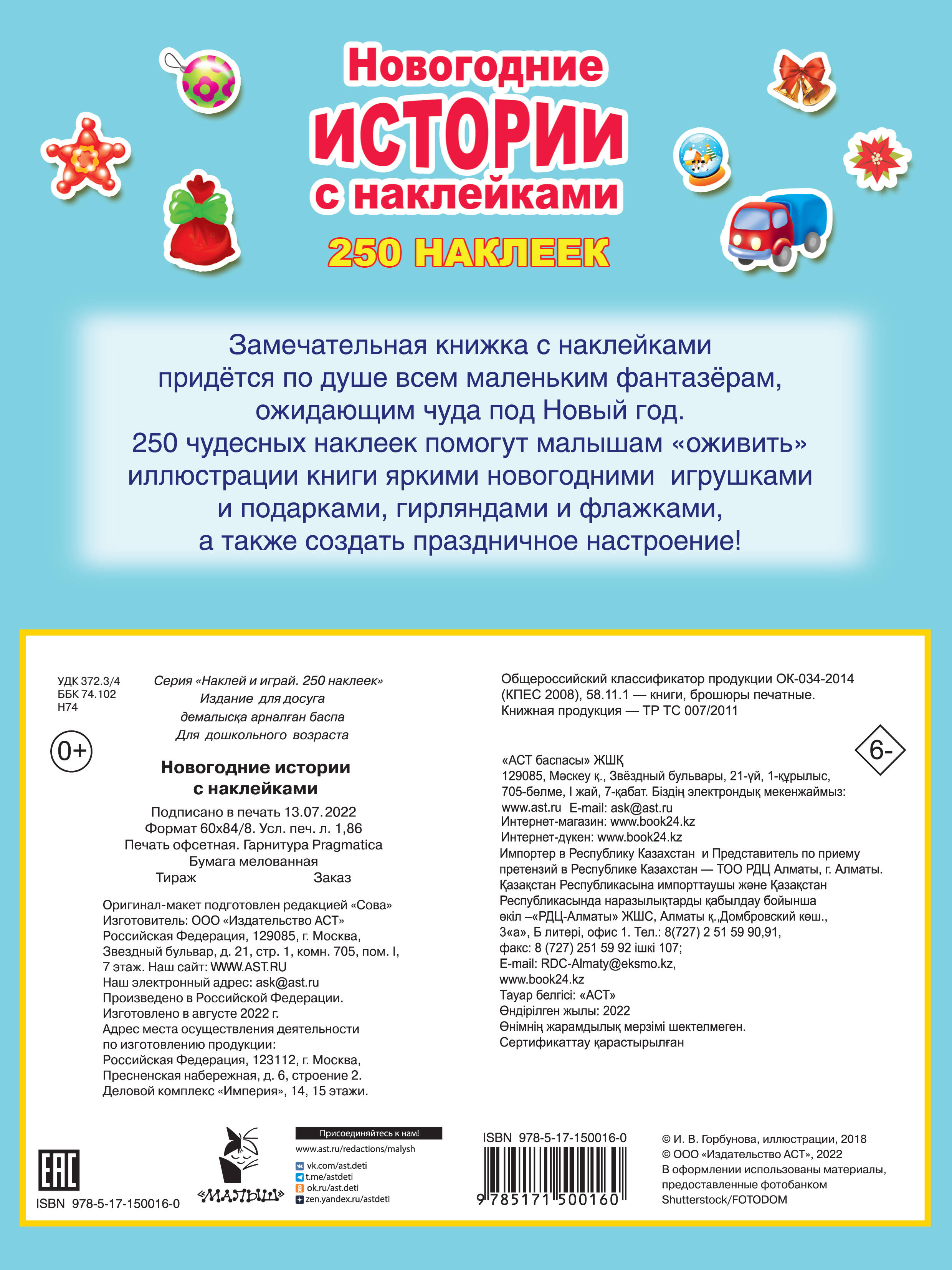«Новогодние истории с наклейками» - это красочные новогодние иллюстрации, а также более 250 новогодних наклеек. Коллекция новогодних наклеек собрана специально для компании дружных и веселых малышей - а также их родителей.| Издательство | ИЗДАТЕЛЬСТВО "АСТ" |