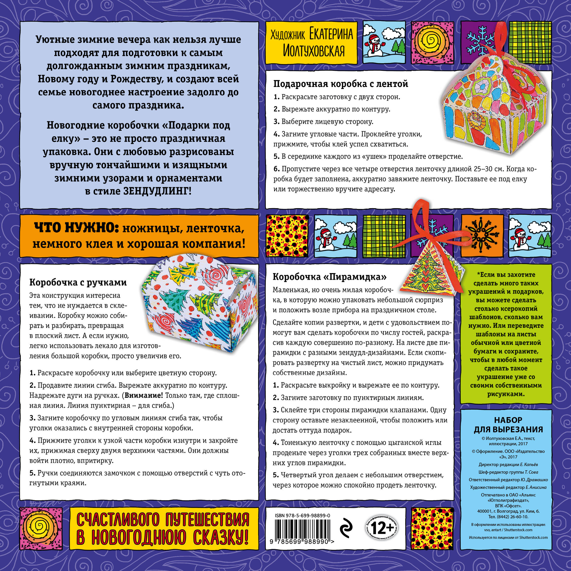 Готовимся к Новому году! В наборе три плотных листа-заготовки с готовыми цветными шаблонами красивых новогодних подарочных коробочекй, разрисованных изящными паттернами в стиле зендудлинг! Три простых шага: вырезать, раскрасить и собрать с помощью клея. Если не любите раскрашивать, воспользуйтесь обратной стороной листа, на которой вы найдете яркий и красивый праздничный паттерн. Хотите много коробочек? Сделайте столько копий шаблона, сколько захотите! Замечательное творческое занятие для детей и взрослых, любящих предновогоднюю суету и предпраздничную атмосферу. Пусть ваш Новый год будет стильным и ярким!| Издательство | Эксмо |