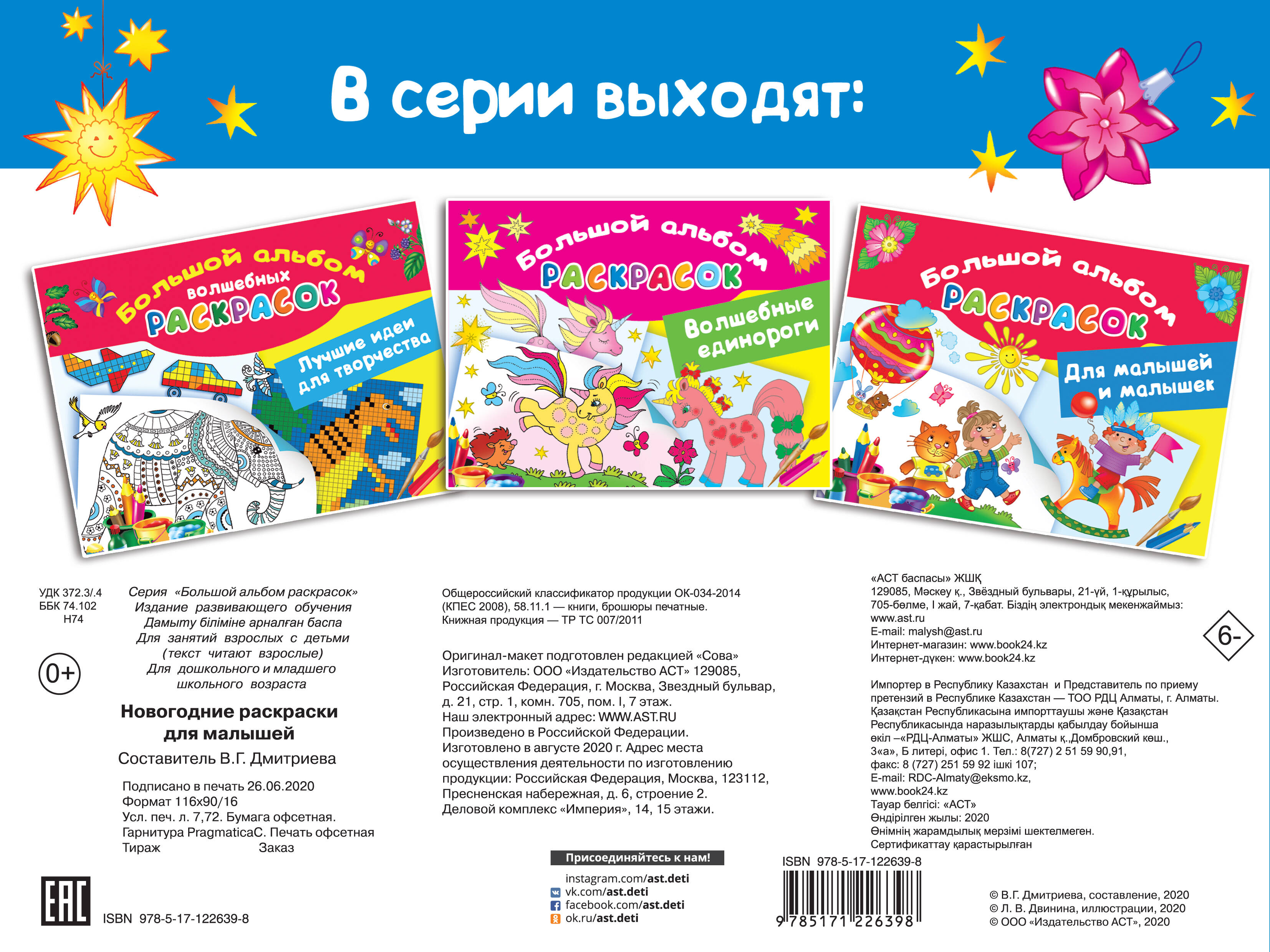 О чем эта книга Этот большой альбом раскрасок о самом сказочном и волшебном времени года - зиме, и, конечно же, про самый любимый зимний праздник - Новый год. Кому эта книга будет интересна Альбом станет отличным подарком под ёлкой каждому малышу. Каковы особенности этой книги Большой альбом раскрасок станет отличным подарком, не только полезным, развивающим воображение, память и чувство цвета, но и создающим радостное праздничное настроение, ведь это целых 64 страницы сказочных новогодних сюжетов. Деда Мороза со Снегурочкой, забавных зверюшек, ёлочку, вкусные сладости, игрушки и подарки малыши раскрасят фломастерами и карандашами. А потом можно будет устроить настоящую выставку рисунков! Раскраска поможет весело и интересно провести новогодние каникулы!| Издательство | ИЗДАТЕЛЬСТВО "АСТ" |