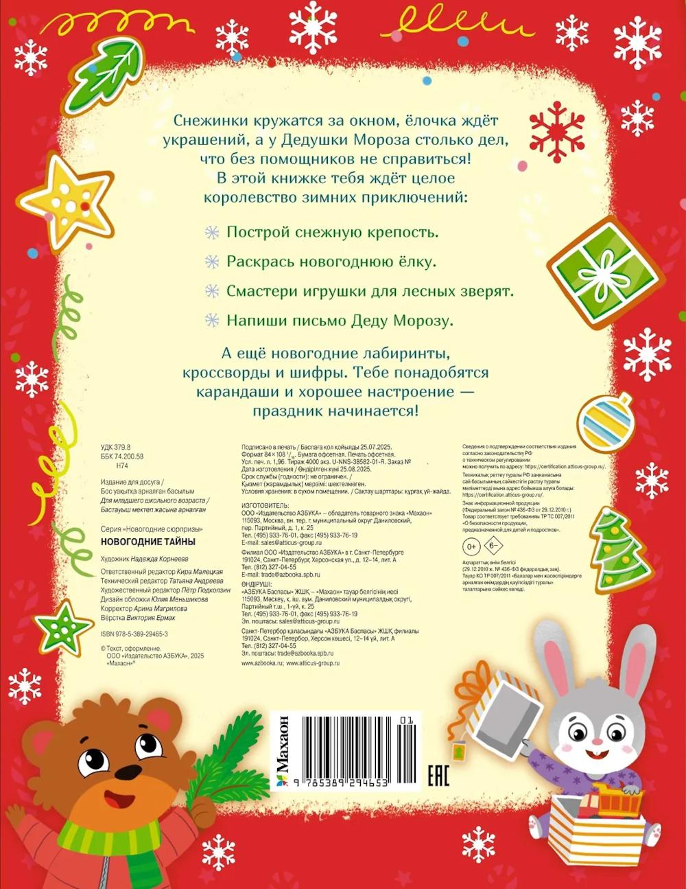 Снежинки кружатся за окном, ёлочка ждёт украшений, а у Дедушки Мороза столько дел, что без помощников не справиться! В этой книжке тебя ждёт целое королевство зимних приключений: Построй снежную крепость. Раскрась новогоднюю ёлку. Смастери игрушки для лесных зверят. Напиши письмо Деду Морозу. А ещё новогодние лабиринты, кроссворды и шифры. Тебе понадобятся карандаши и хорошее настроение - праздник начинается!| Издательство | Махаон |