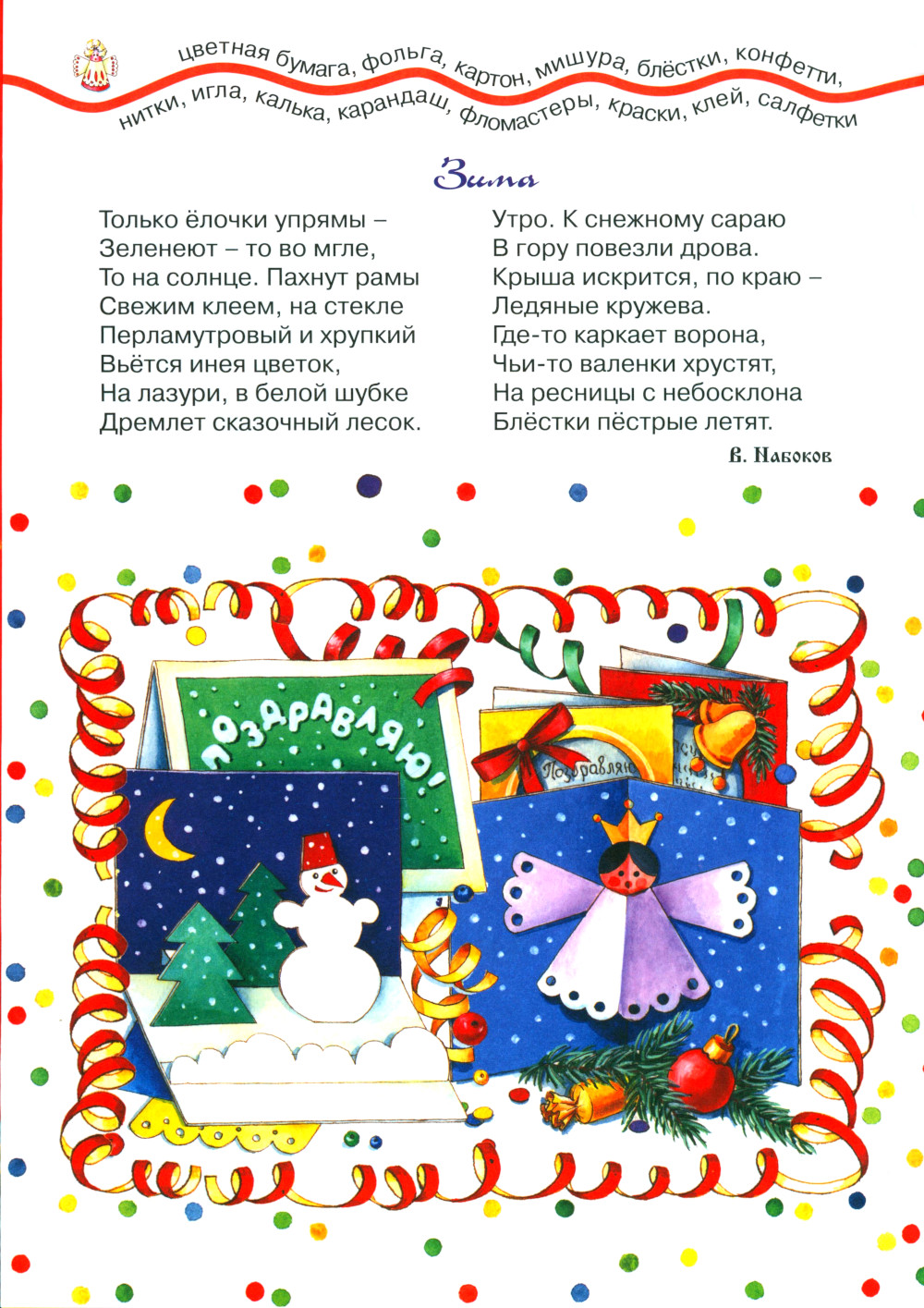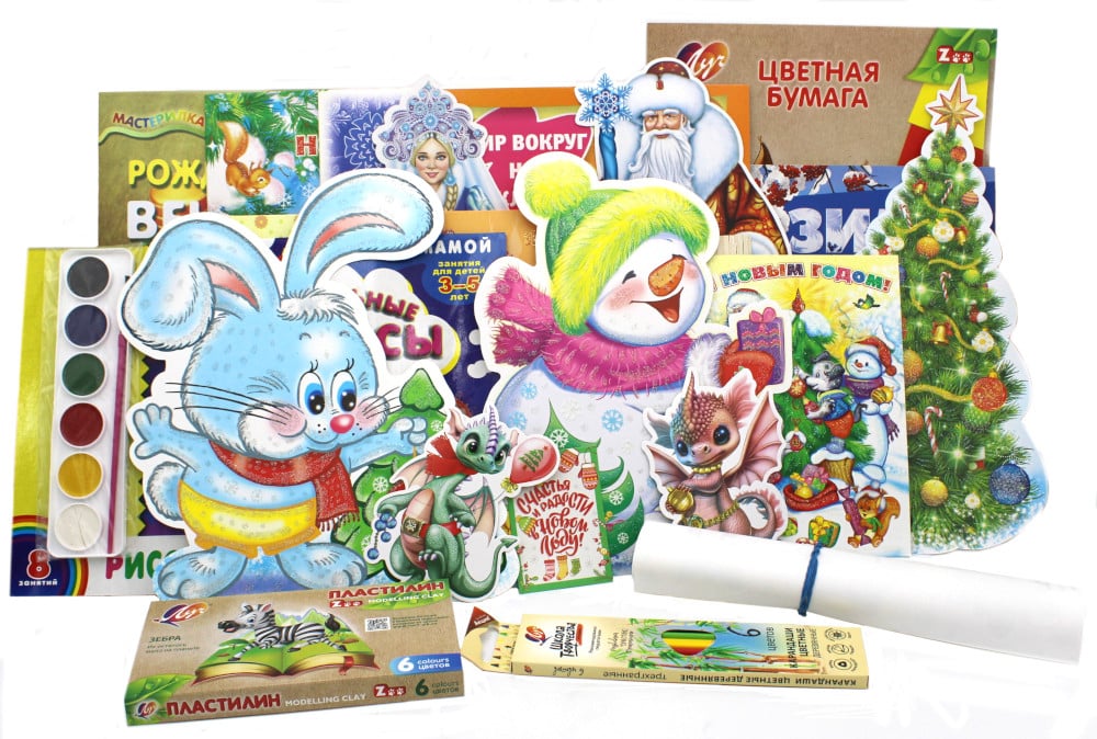 В «Новогодний чемоданчик № 2» входит: Развитие творческих способностей: 1. Простая лепка. Морские животные (для детей 2-7 лет) 2. Альбом Рисование акварелью «Удивительные кляксы» (для детей 3-5 лет) + акварельные краски с кисточкой 3. СНЕЖИНКИ. Простые снежинки. Вырезаем из бумаги 4. Мастерилка. Рождественский веник. Азбука самоделок 5. Коллекция новогодних раскрасок. В гостях у Деда Мороза Чтение интересных и поучительных историй: 6. Сборник сказок. Глупый Змей 7. Беседы с ребенком. Зима (комплект для познавательных игр с детьми 8 картинок с текстом на обороте, в папке, А5) Игры с наклейками: 8. Истории с наклейками. Времена года. Многоразовые наклейки для детей от 2 лет 9. Набор новогодних наклеек. Новогодние снежинки 10. Игра «Найди и покажи» на обороте чемоданчика Яркие украшения для праздничного настроения: 11. ФМ1-15265 Плакат вырубной А4. Дед Мороз. Двухсторонний 12. ФМ1-15266 Плакат вырубной А4. Снегурочка в кокошнике. Двухсторонний 13. ФМ-13427 Плакат вырубной А4. Снеговик (с блестками в лаке) 14. ФМ-14456 Плакат вырубной А4. Зайчик с Новогодней елкой (блестки в лаке) 15. ФМ-10895 Плакат вырубной А4. Елочка новогодняя (с блестками в лаке) 16. М-15231 Вырубная фигурка. Дракон девочка. Двухсторонняя 17. М-15232 Вырубная фигурка. Дракон мальчик. Двухсторонняя Поздравительные открытки: 18. Открытка среднего формата С Новым годом! В ассортименте 19. Б-15308 Бирка. Тепла и уюта в новом году! 20. Б-15306 Бирка. Счастья и радости в новом году! Подарок: 1. Пластилин Луч Zoo 6 цветов х 15 гр. 2. Бумага цветная Луч ZOO «Рысь» 8 цветов А4 8 листов 3. Карандаши цветные Луч Школа творчества деревянные трехгранные цветов Чемоданчик создаст новогоднее настроение и атмосферу в ваших домах!