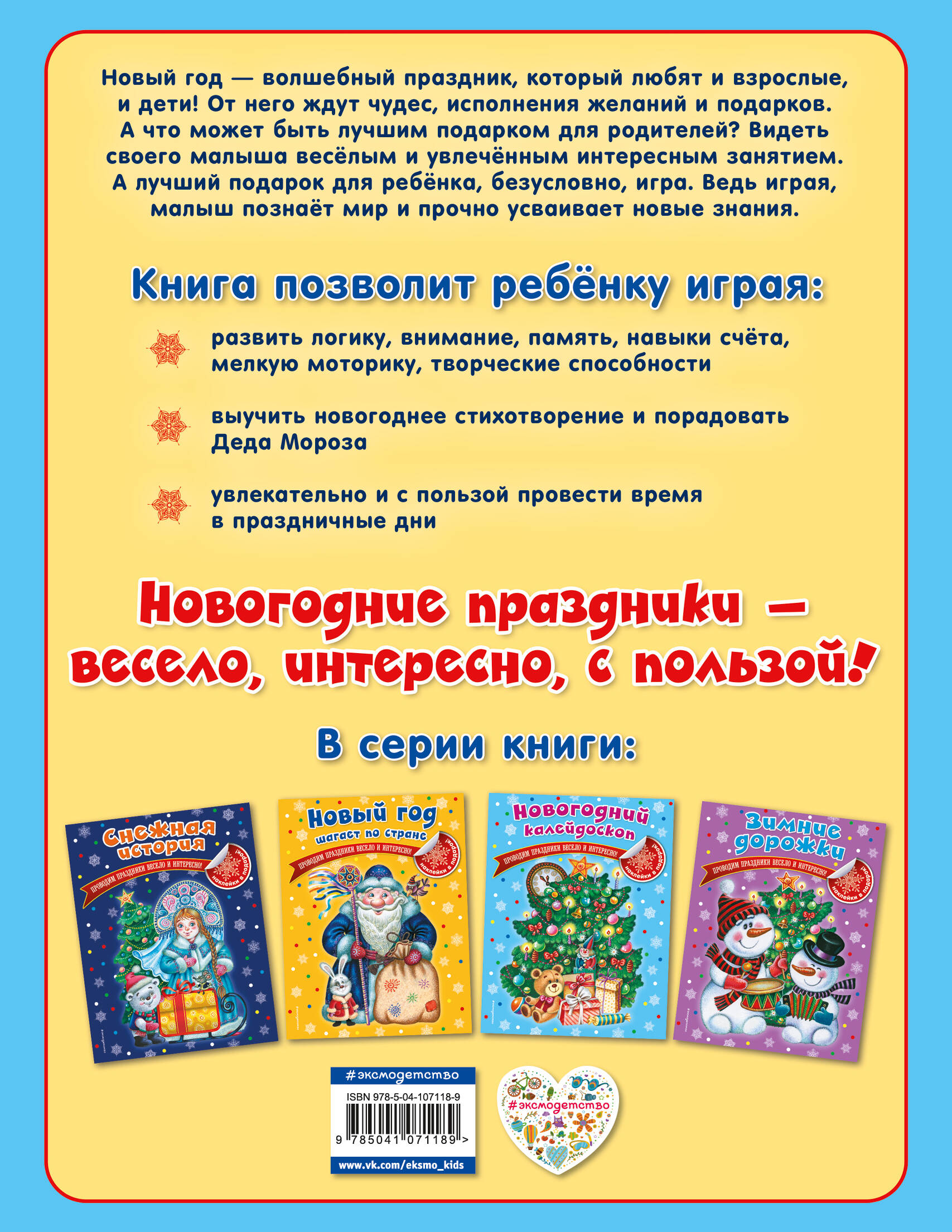 Приобретая эту книгу, вы сможете: 1) развить у ребенка мелкую моторику с помощью раскрашивания и наклеек, 2) развить логическое мышление, внимание, навыки счета и устной речи, память, воображение, 3) расширить кругозор, 4) развить творческие способности, 5) с пользой и интересом организовать досуг ребенка и порадовать его новогодним подарком.| Издательство | ООО "Издательство "Эксмо" |