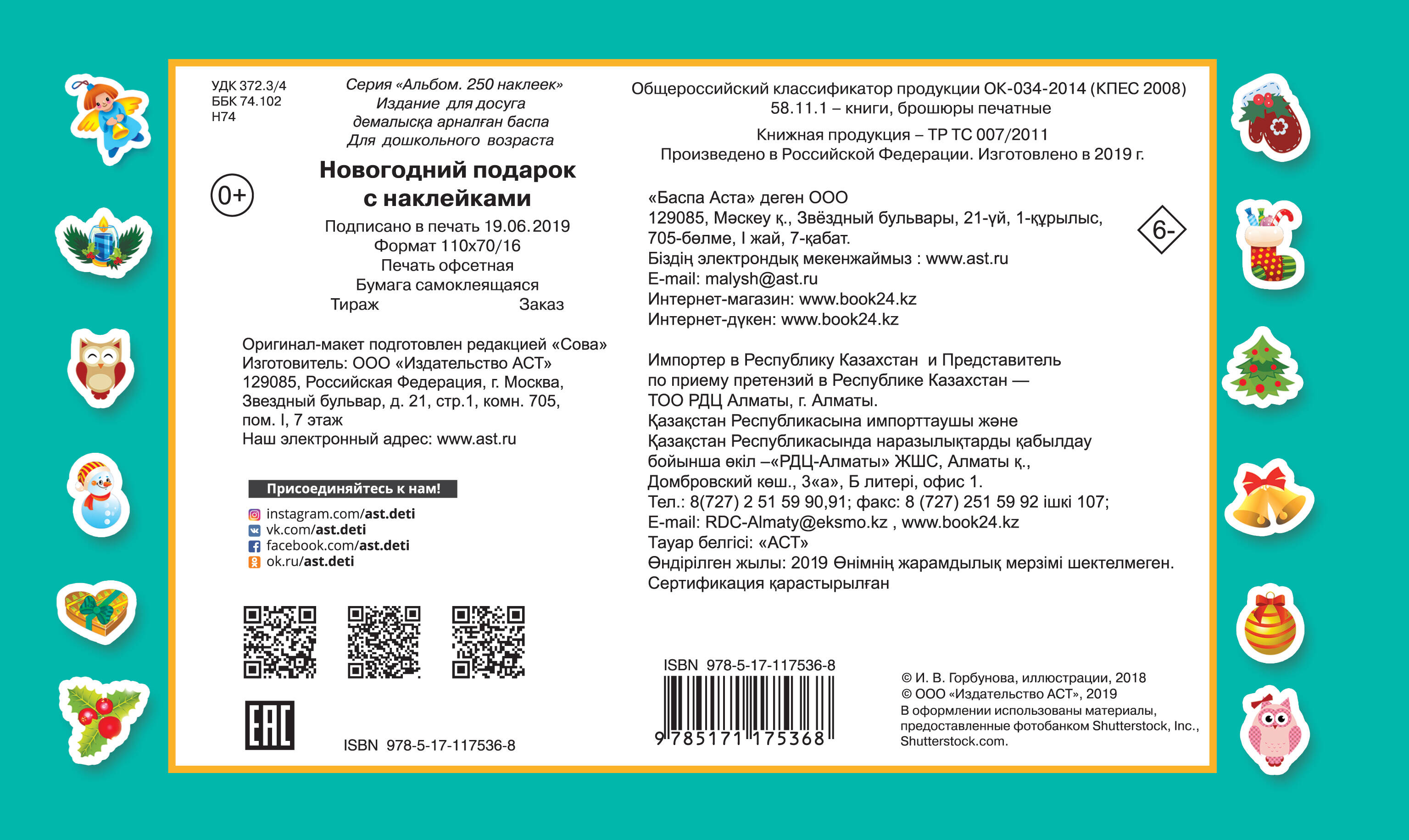 О чем эта книга На страничках книжки много-много наклеек - снежинок, чудесных зверей и птиц, ярких гирлянд и игрушек. В этом сказочном альбоме наклеек таится настоящее новогоднее чудо! Кому эта книга будет интересна С набором «Новогодний подарок с наклейками. Альбом 250 наклеек» каждый маленький фантазёр может создать атмосферу праздника, украсив игрушки, рисунки и поделки 250 новогодними наклейками. Каковы особенности этой книги Альбом из 250 ярких наклеек - для маленьких любителей сказок и новогодних чудес. Игры с наклейками - не только очень весёлое, но и полезное занятие, развивающее мелкую моторику, пространственное мышление, координацию движений и воображение. Прекрасное полиграфическое исполнение - хороший, современный дизайн, яркие наклейки отличного качества. Уникальная коллекция 250 наклеек позволит ребёнку интересно и весело провести новогодние праздники!| Издательство | ИЗДАТЕЛЬСТВО "АСТ" |