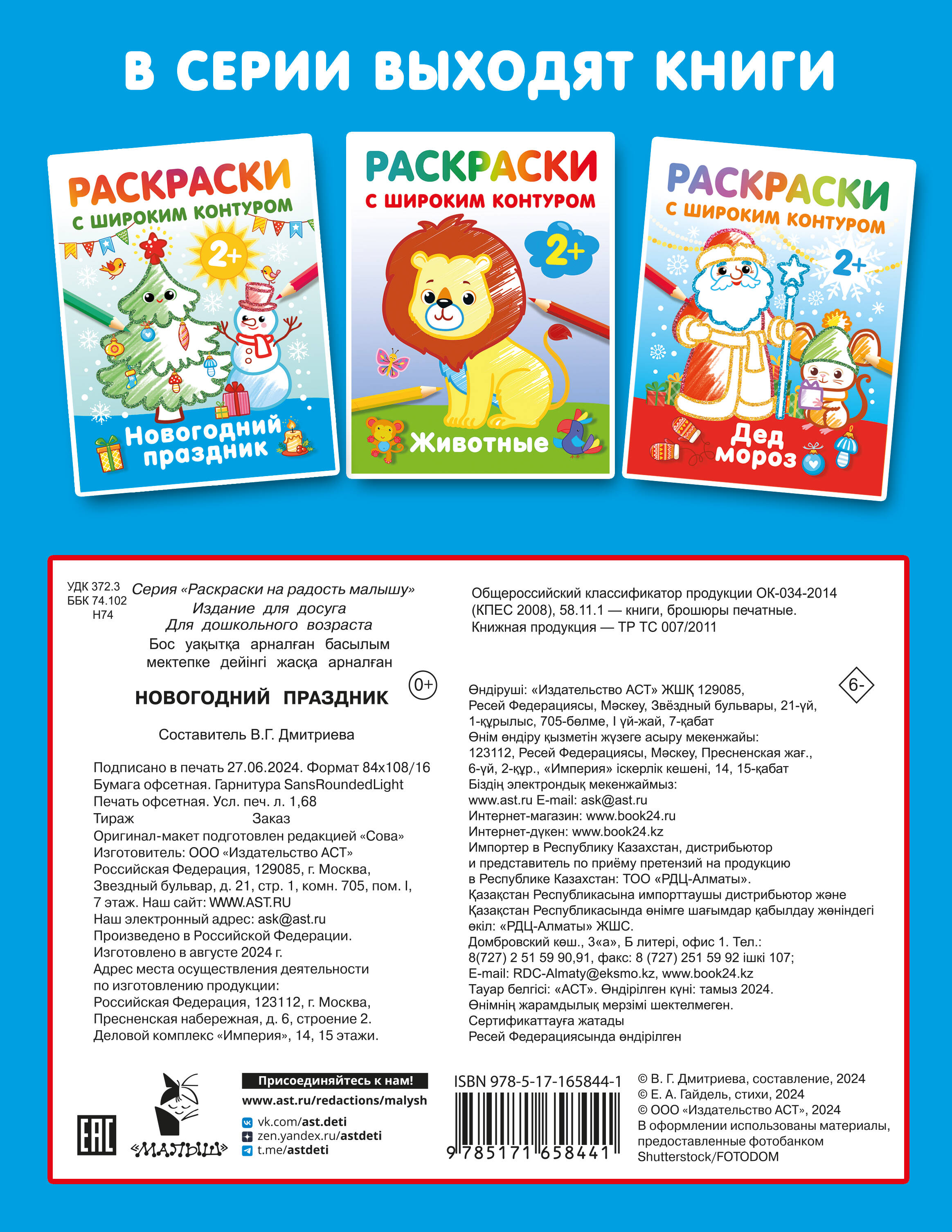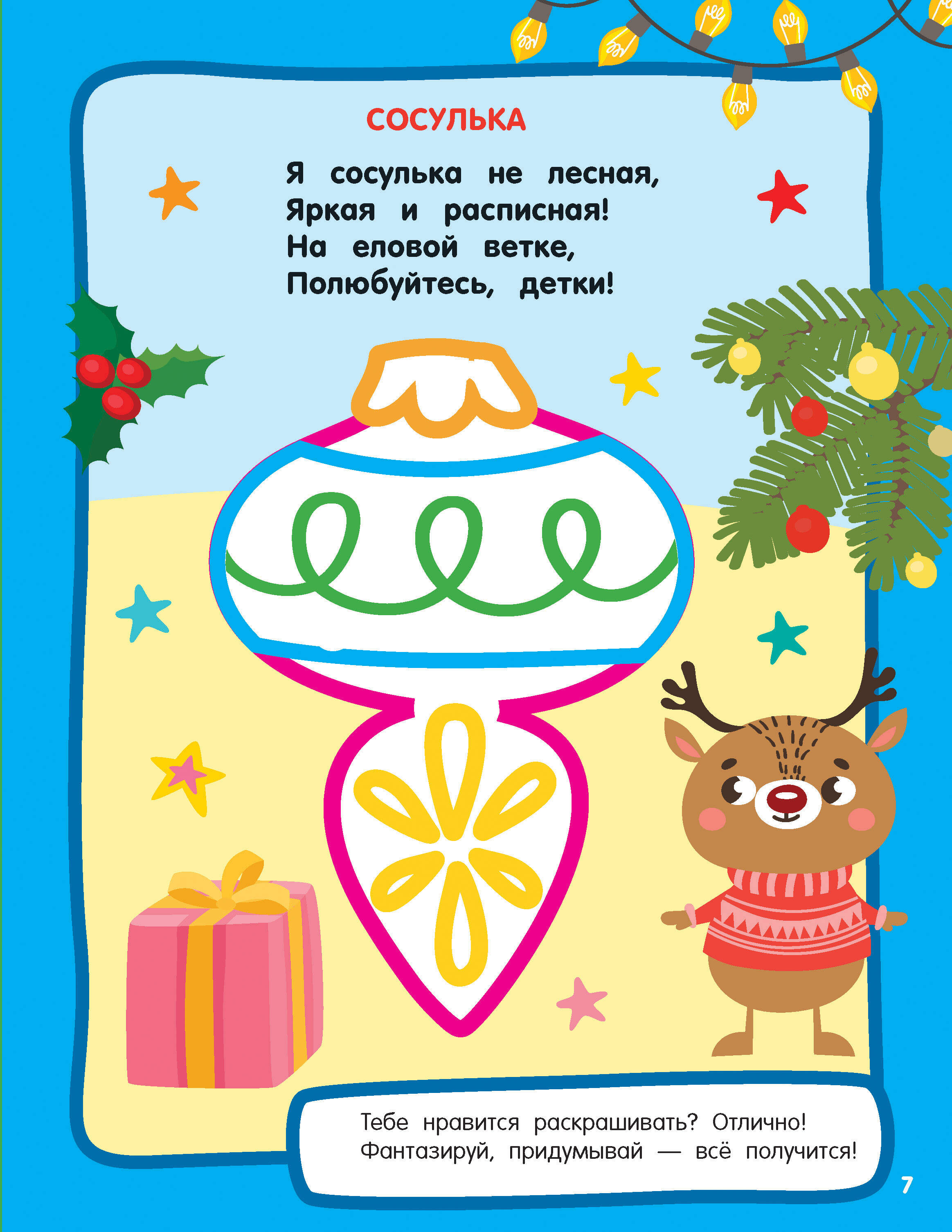В книгах новой развивающей серии «Раскраски на радость малышу» - забавные картинки с широким цветным контуром + развивающие задания + весёлые стихи об игрушках. Раскрашивать картинки с цветным широким контуром интересно и очень полезно - такие занятия расширяют кругозор и словарный запас, формируют графические навыки, развивают мышление, память, внимание, наблюдательность и творческие способности. Помогите ребенку раскрасить нарядную ёлочку, Дедушку Мороза или сладкие подарки цветными карандашами, маркерами и мелками, красками - подарите малышу счастливые минуты совместного творчества. И конечно - новогоднее настроение! Малыш постарается всё сделать аккуратно - и у него обязательно получатся замечательные картинки, которыми можно будет украсить детскую комнату к празднику. Играйте, раскрашивайте, разучивайте стихи вместе с малышом! Проводите время всей семьёй, и пусть все ваши мечты и желания сбудутся в Новом году!| Издательство | Издательство "АСТ" |