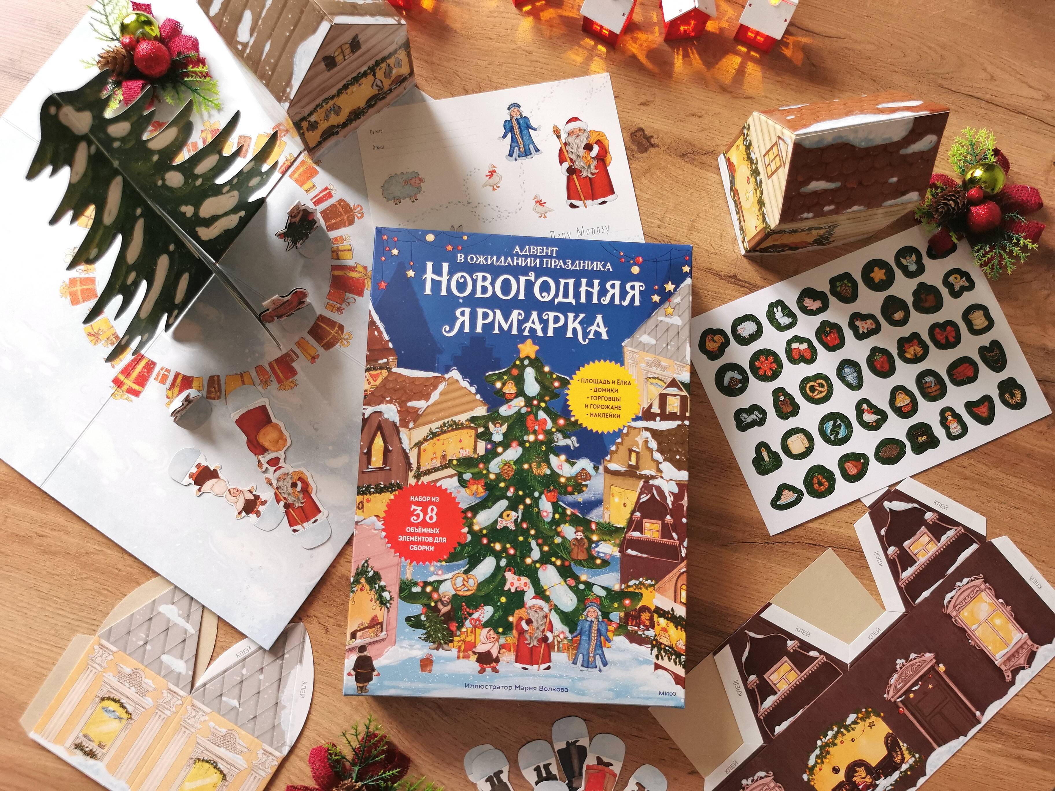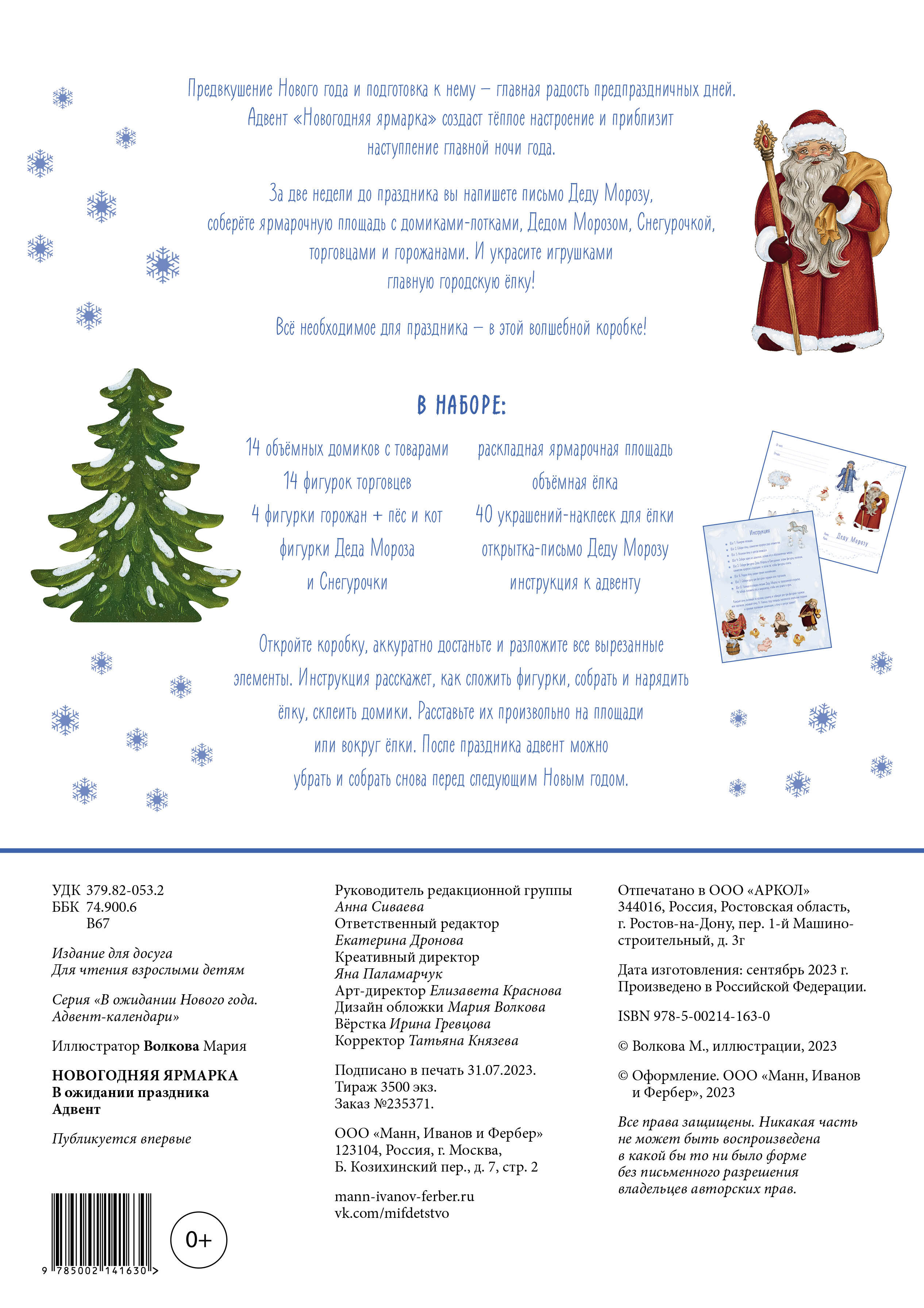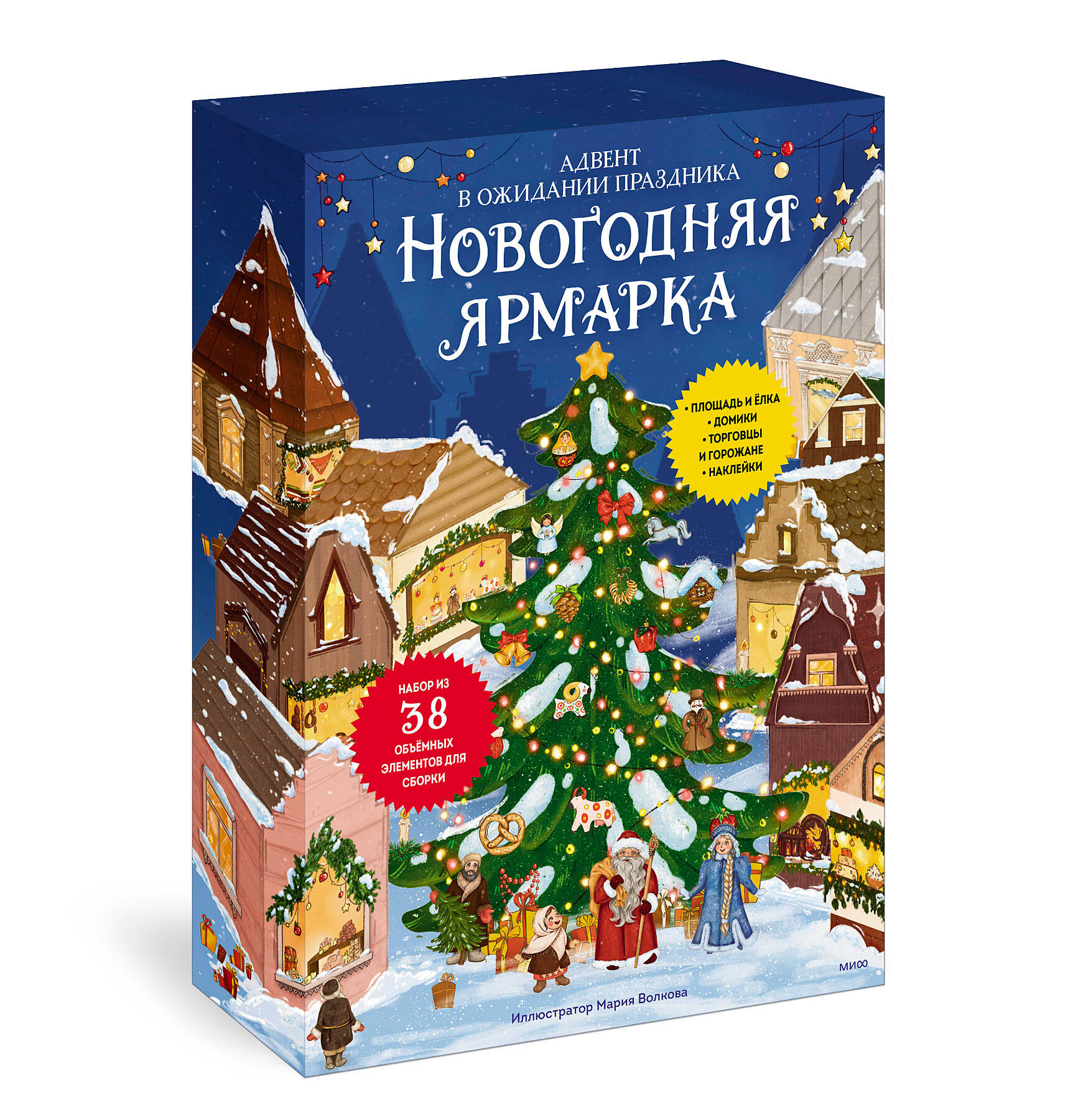 В декабре по всей нашей стране открываются новогодние ярмарки. Сияет праздничная елка, в домиках-лотках торговцы продают русские игрушки, сладости и сувениры. Над площадью пахнет хвоей и корицей. Горожане гуляют, пробуют горячий чай и пряники, выбирают подарки для близких. Создайте атмосферу праздника с помощью этого адвента! В волшебной коробке - площадь с елкой, торговцы и домики, горожане, которые прогуливаются по заснеженным улочкам, Снегурочка и Дед Мороз. Все это вы соберете своими руками. А еще узнаете, из какой русской губернии привезены товары и почему именно они. Внутри есть инструкция, которая расскажет, как правильно разложить ярмарочное поле, установить елку и склеить домики. Все элементы вырезаны, ребенку остается только собрать их и расставить. А затем - украсить центр стола или книжную полку. Добавьте щепотку фантазии и оживите ярмарочную площадь - всей семьей разыгрывайте сценки, придумывайте задания и загадывайте желания. Пусть они непременно сбудутся! В комплекте: 14 объемных домиков с товарами 14 фигурок торговцев 6 фигурок горожан фигурки Деда Мороза и Снегурочки раскладная ярмарочная площадь объемная елка наклейки с игрушками для елки открытка-письмо Деду Морозу Фишки адвента: - Поможет создать предновогоднее настроение. - Повод собрать семью за увлекательным занятием. - Новогоднее украшение для дома. - Все необходимое для праздника - в одной волшебной коробке! Для кого этот адвент: Для детей от 5 лет. Для всей семьи.