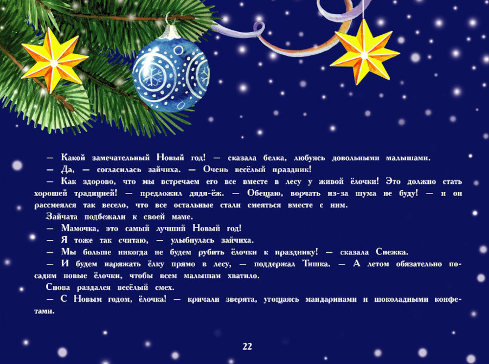 Вот и наступила зима. Землю укутало снежком, на окнах мороз нарисовал причудливые узоры. А значит, скоро Новый год! Зайчата Тишка и Снежка решили отправиться в лес за ёлочкой. Только в лесу уже кто-то похозяйничал: кругом одни пеньки и щепки. Так и ёлочек в лесу не останется! Что же делать маленьким зайчатам? Как встречать Новый год без ёлочки? Но беда - не беда, если рядом есть мама, мудрый ёж и добрые друзья!