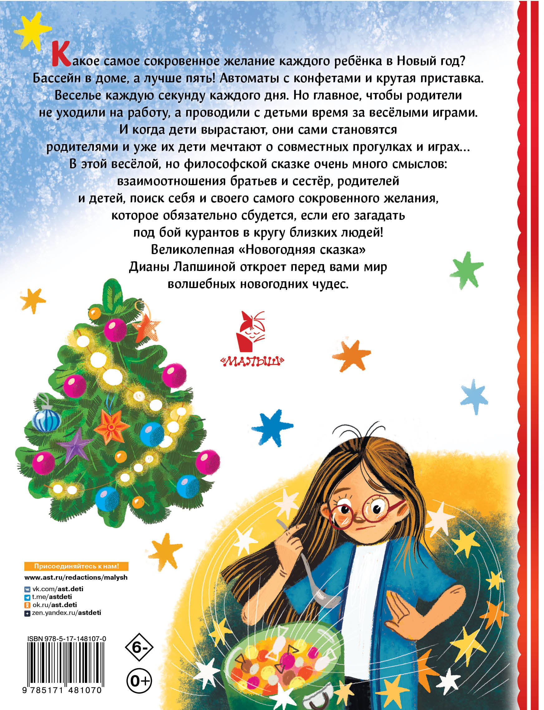 Какое самое сокровенное желание каждого ребёнка в Новый год? Бассейн в доме, а лучше пять! Автоматы с конфетами и крутая приставка. Веселье каждую секунду каждого дня. Но главное, чтобы родители не уходили на работу, а проводили с детьми время за весёлыми играми. И когда дети вырастают, они сами становятся родителями и уже их дети мечтают о совместных прогулках и играх… В этой весёлой, но философской сказке очень много смыслов: взаимоотношения братьев и сестёр, родителей и детей, поиск себя и своего самого сокровенного желания, которое обязательно сбудется, если его загадать под бой курантов в кругу близких людей! Великолепная «Новогодняя сказка» Дианы Лапшиной откроет перед вами мир волшебных новогодних чудес.| Издательство | АСТ |