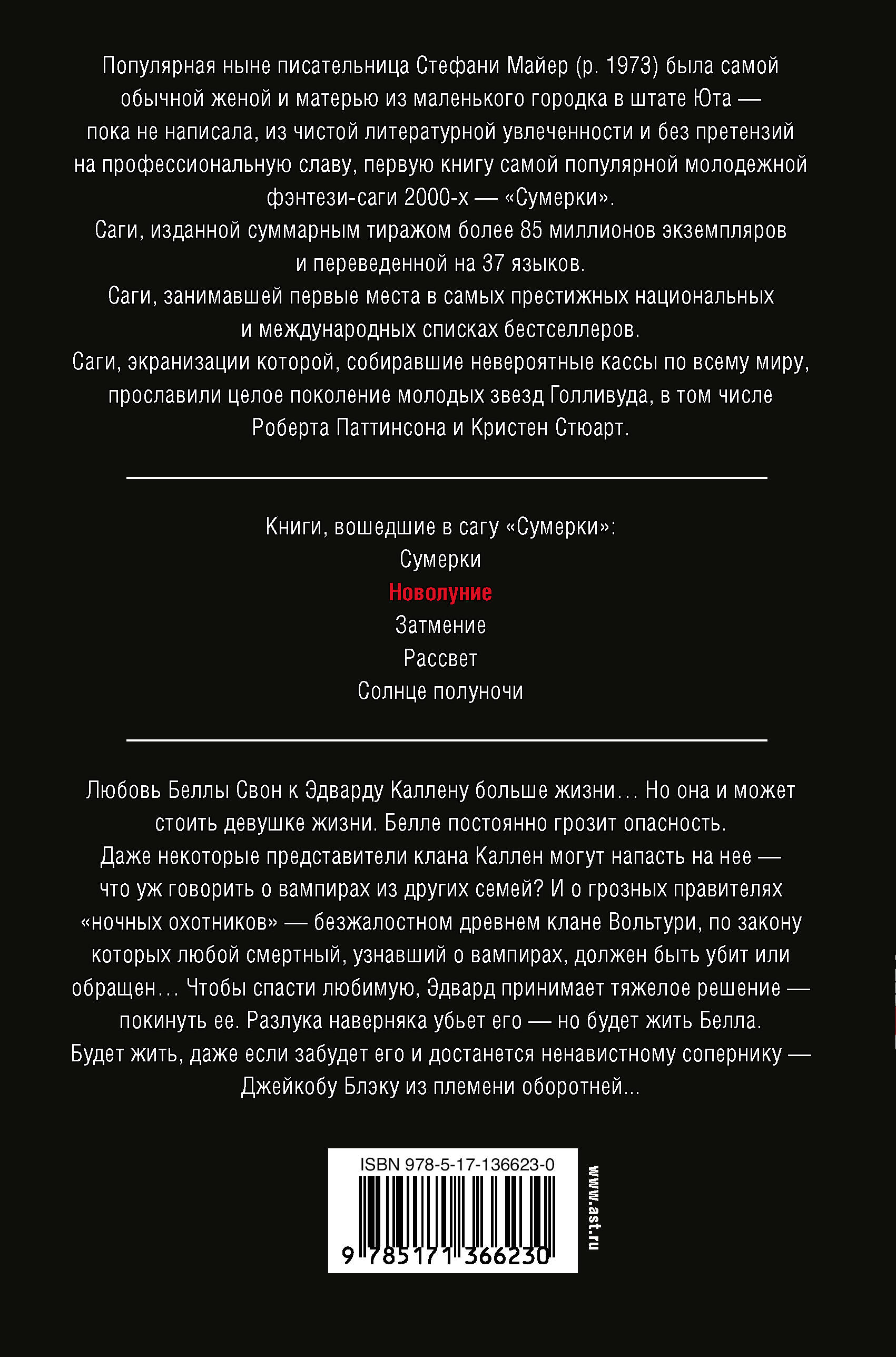 История любви старшеклассницы и вампира покорила сердца миллионов людей. Стефани Майер, создательница саги «Сумерки», два года подряд признавалась лучшей писательницей США, её книги были переведены на 38 языков, а общий тираж «Сумеречной саги» превышает 150 000 000 экземпляров. Сага легла в основу одноимённой киносерии с Робертом Паттисоном и Кристен Стюарт в главных ролях, пять фильмов цикла заработали в мировом прокате свыше 4 миллиардов долларов. «Новолуние» - вторая книга цикла. Белла любит Эдварда всем сердцем, но их отношения могут стоить девушки жизни. Белле постоянно грозит опасность - на неё точат клыки отдельные представители клана Калленов и вампиры из других семей, а уж что будет, если о существовании девушки узнают правители «ночных охотников» - представители безжалостного клана Вольтури? Ведь по древнему закону любой смертный, узнавший о существовании вампиров, должен быть убит или обращён. Ради спасения любимой Эдвард принимает тяжелое решение расстаться с ней. Разлука наверняка дастся ему нелегко, тем более что за Беллой уже начинает увиваться ненавистный соперник - Джейкоб Блэк из племени оборотней. Вашему вниманию предлагается специальное переиздание в новом оформлении, приуроченном к выходу «Солнца полуночи», новой книги цикла. Соберите всю сагу в едином оформлении!| Издательство | ИЗДАТЕЛЬСТВО "АСТ" |