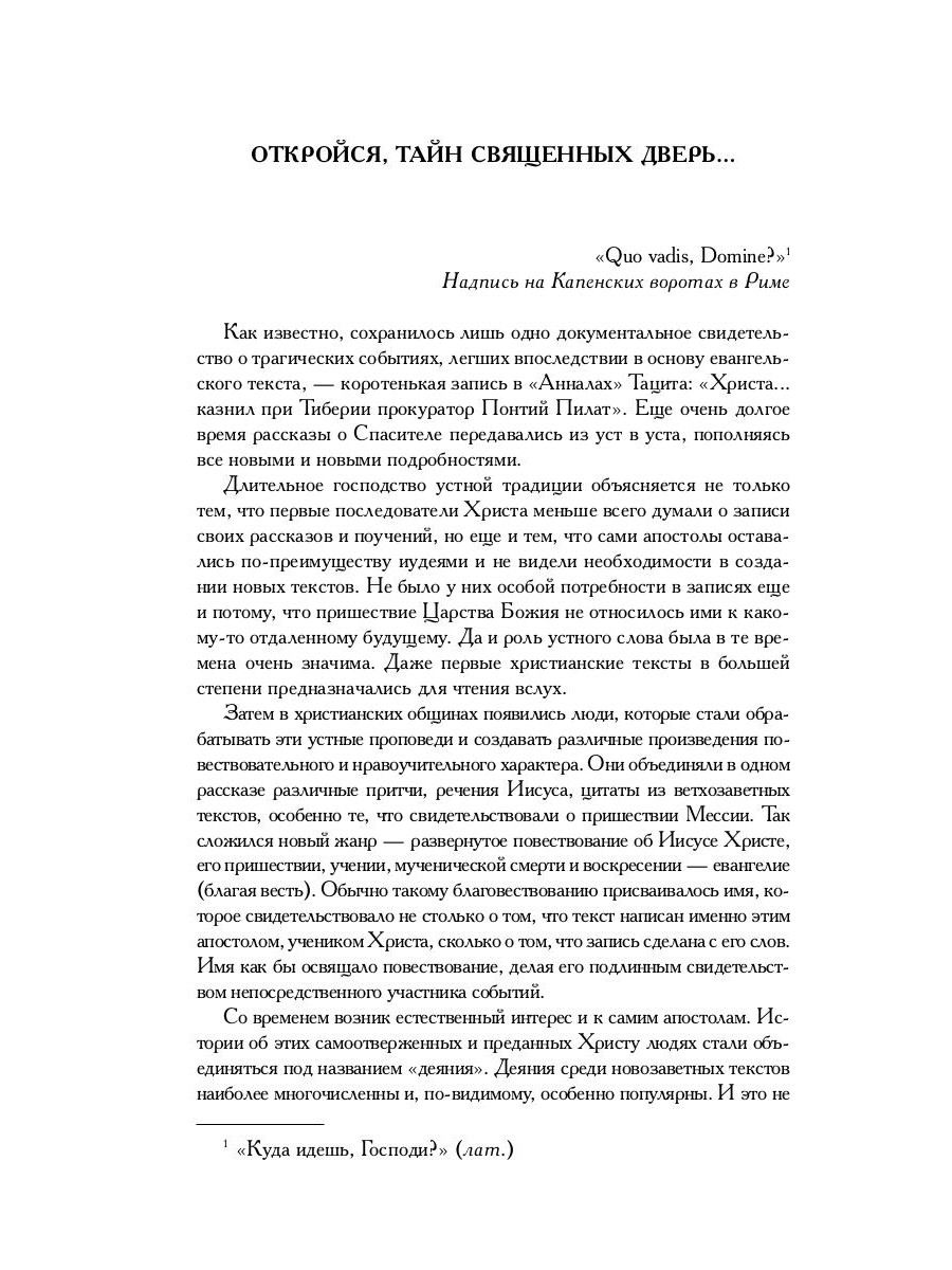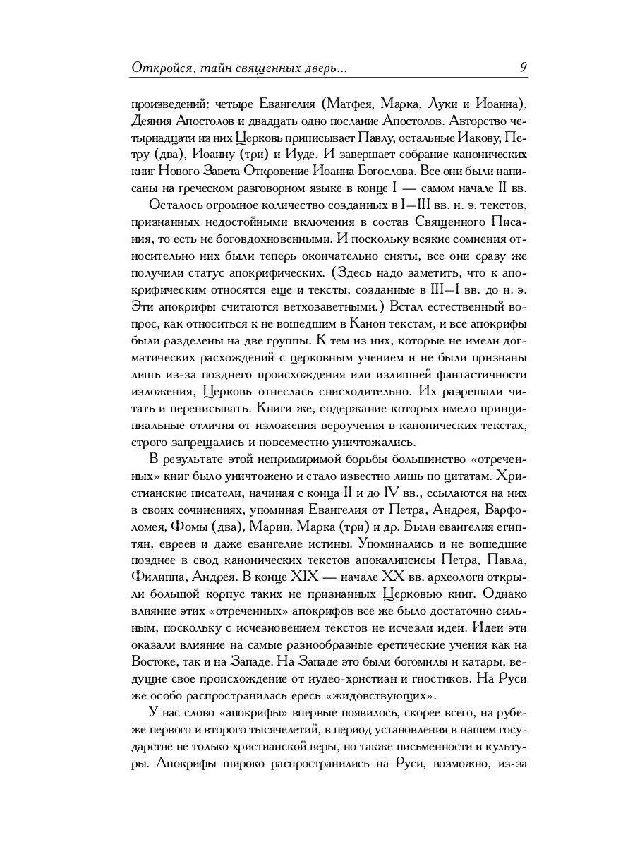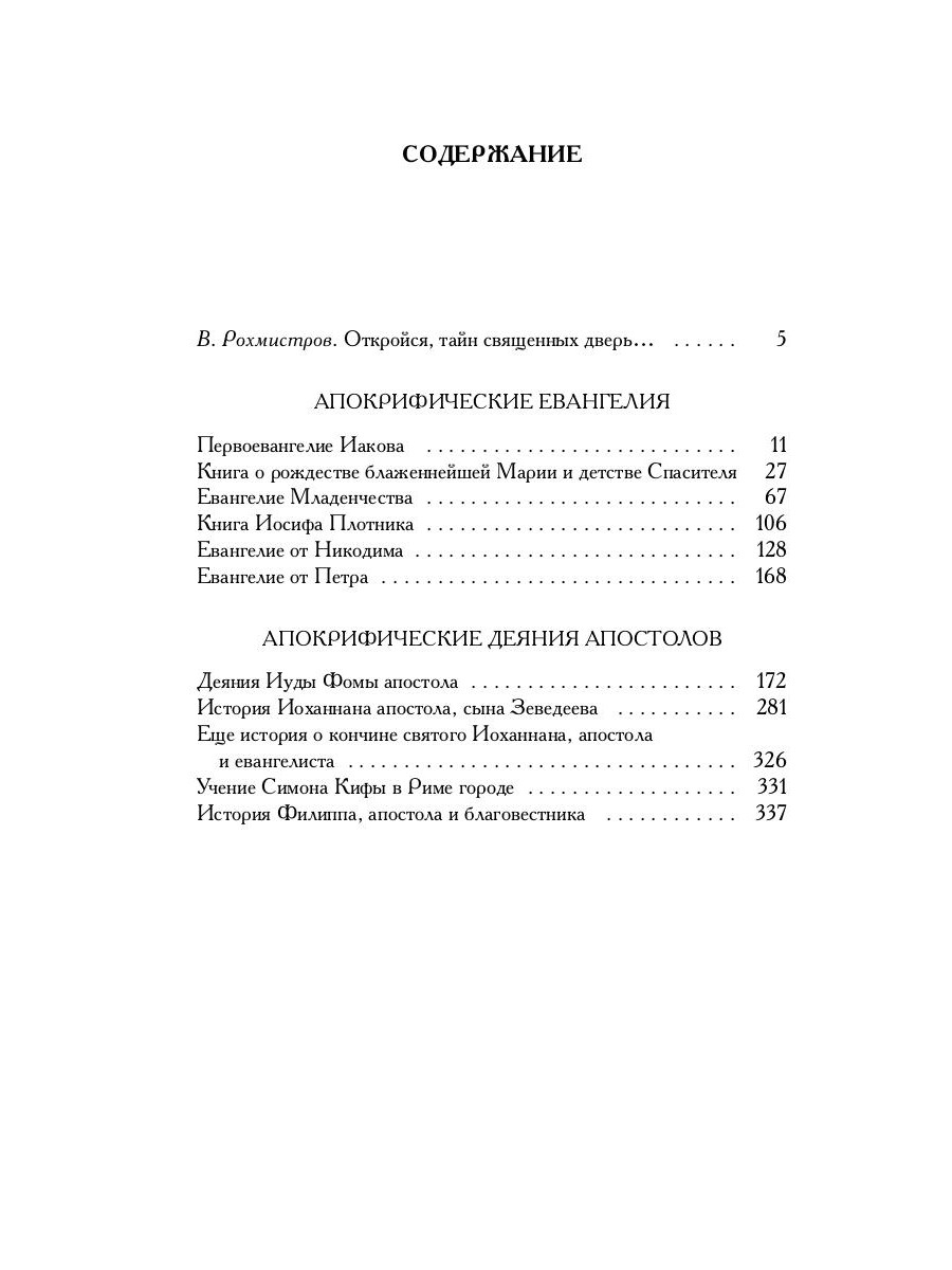 В настоящий сборник включены апокрифические евангелия и деяния апостолов. Их жанровое деление условно, оно восходит к литературным образцам канонического Нового Завета. Все сказания объединены описанием религиозной борьбы эпохи и принадлежностью действующих в них лиц к первоевангельской христианской общине. Публикуемые евангелия рассказывают о появлении на свет и жизни Пресвятой Богородицы, об Иосифе-плотнике и Рождестве Христове, о детстве и жизни Христа до начала общественного служения, о страстях Господних, Его крестной смерти и светлом Воскресении. Апокрифические деяния апостолов представлены здесь пятью сказаниями о четырех учениках Господа: Фоме, Иоанне, Петре и Филиппе.