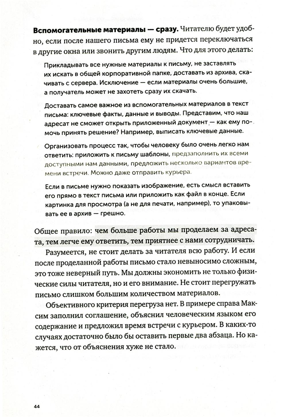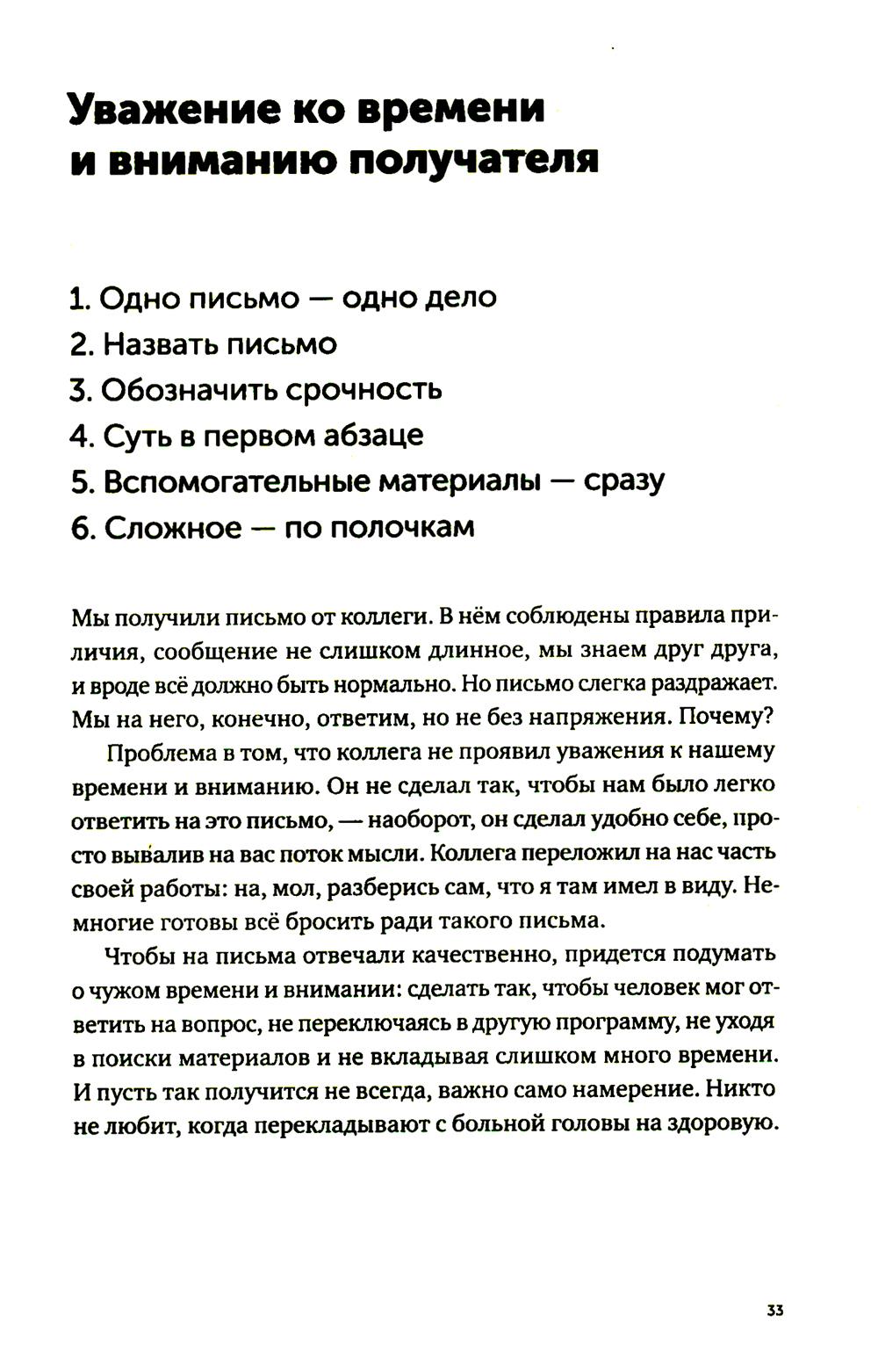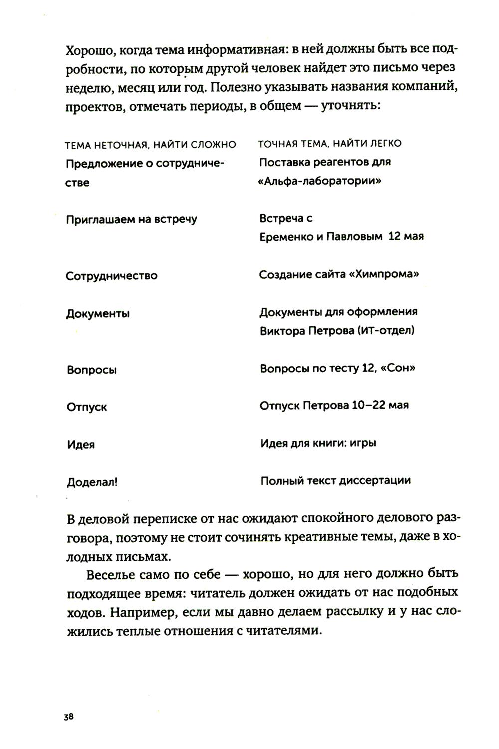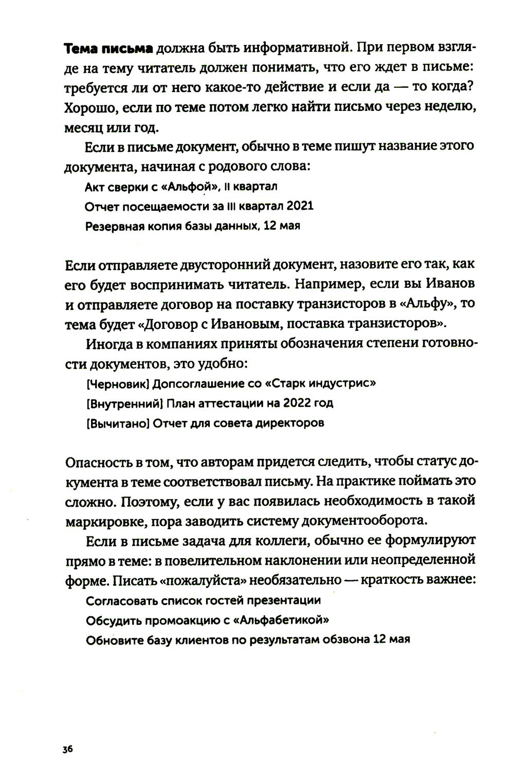 Последние двадцать лет нас учили, что деловая переписка - это бесконечные реверансы, бессмысленные формы вежливости и вымученные шаблоны: «Коллеги, я вас услышал», «Клиент прислал правочки, внесите АСАП. Заранее спасибо», «С уважением к вам и вашему бизнесу». Современное деловое письмо - это махровая фальшь, копеечные манипуляции и плохо скрываемое обоюдное презрение. Максим Ильяхов и Людмила Сарычева, авторы культовой книги «Пиши, сокращай», предлагают менять культуру делового письма и выдвигают два новых правила: уважение к адресату и забота о его интересах. Письма, составленные по таким правилам, располагают к вам людей и помогают находить общий язык. Следуя рекомендациям из книги, вы научитесь писать коммерческие предложения, сопроводительные письма, просьбы коллегам, ответы клиентам и любые другие рабочие письма. Это обязательная книга для всех, кто пишет по работе: руководителей, менеджеров, специалистов и соискателей.| Издательство | Альпина Паблишер |