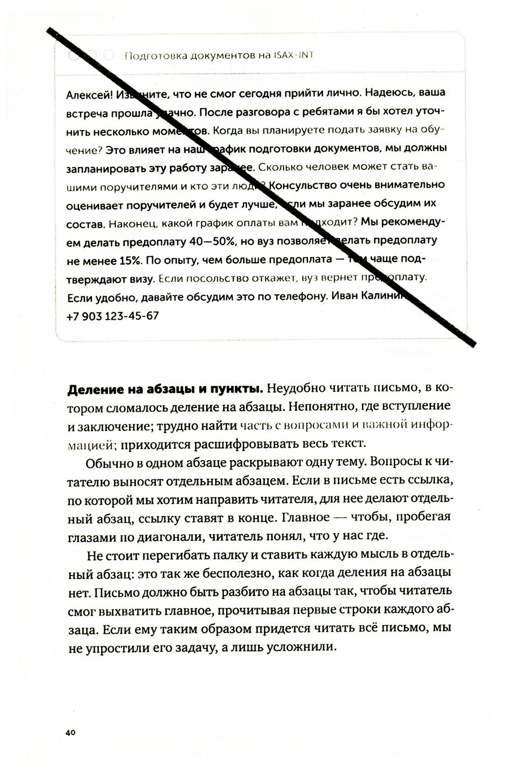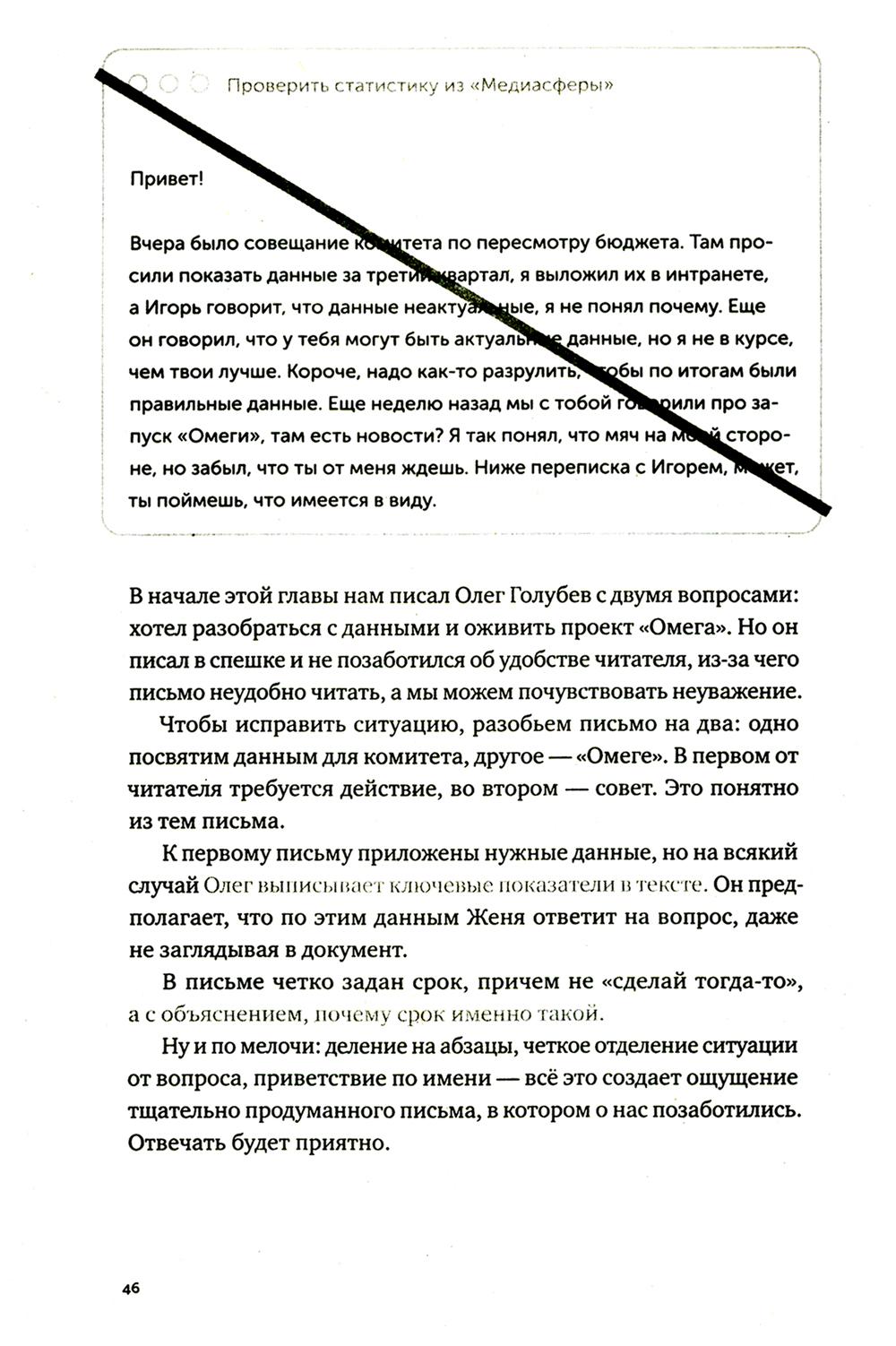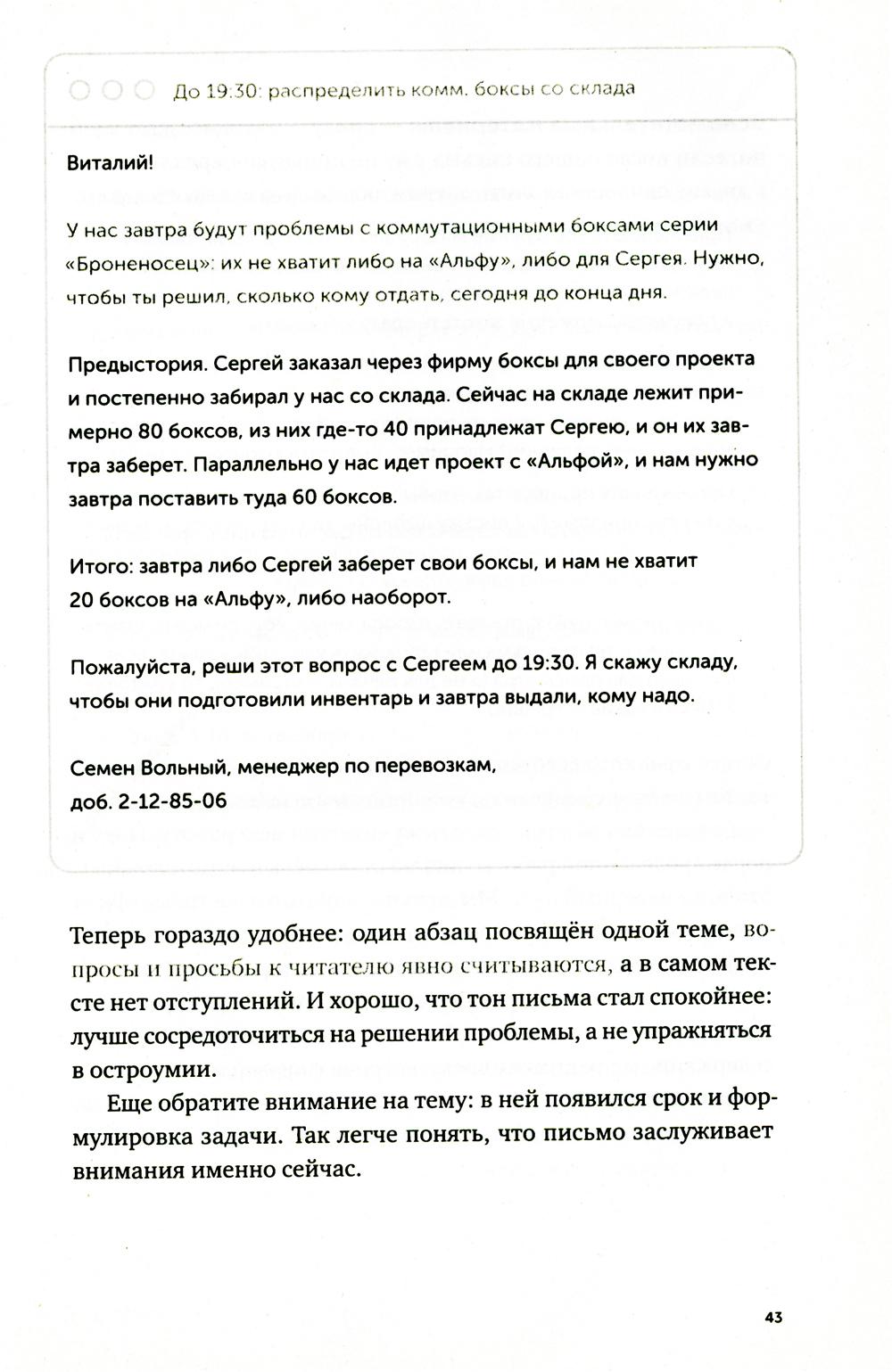 Последние двадцать лет нас учили, что деловая переписка - это бесконечные реверансы, бессмысленные формы вежливости и вымученные шаблоны: «Коллеги, я вас услышал», «Клиент прислал правочки, внесите АСАП. Заранее спасибо», «С уважением к вам и вашему бизнесу». Современное деловое письмо - это махровая фальшь, копеечные манипуляции и плохо скрываемое обоюдное презрение. Максим Ильяхов и Людмила Сарычева, авторы культовой книги «Пиши, сокращай», предлагают менять культуру делового письма и выдвигают два новых правила: уважение к адресату и забота о его интересах. Письма, составленные по таким правилам, располагают к вам людей и помогают находить общий язык. Следуя рекомендациям из книги, вы научитесь писать коммерческие предложения, сопроводительные письма, просьбы коллегам, ответы клиентам и любые другие рабочие письма. Это обязательная книга для всех, кто пишет по работе: руководителей, менеджеров, специалистов и соискателей.| Издательство | Альпина Паблишер |