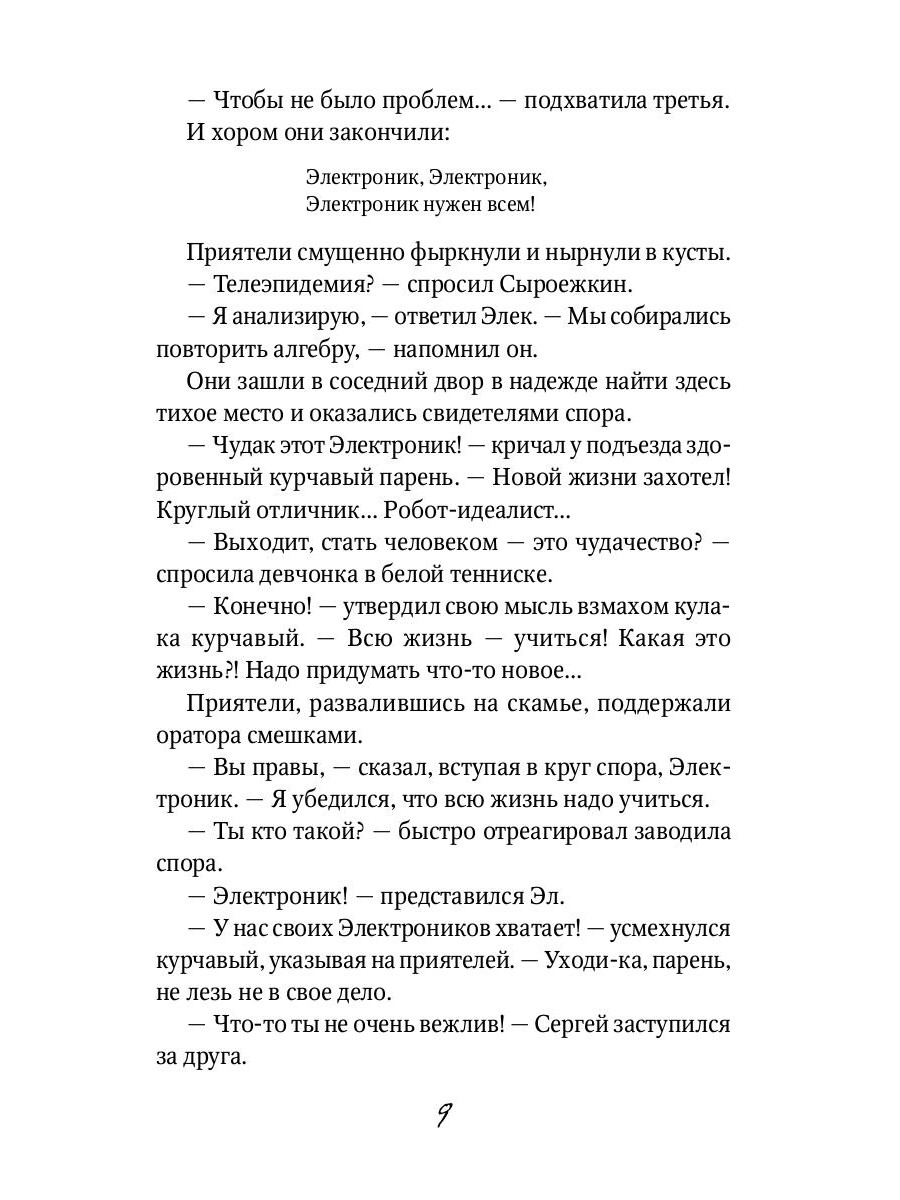 Повесть «Новые приключения Электроника» завершает цикл Е. Велтистова об удивительном мальчике Электронике. В этой книге читатели встретятся с еще одним удивительным изобретением профессора Громова.