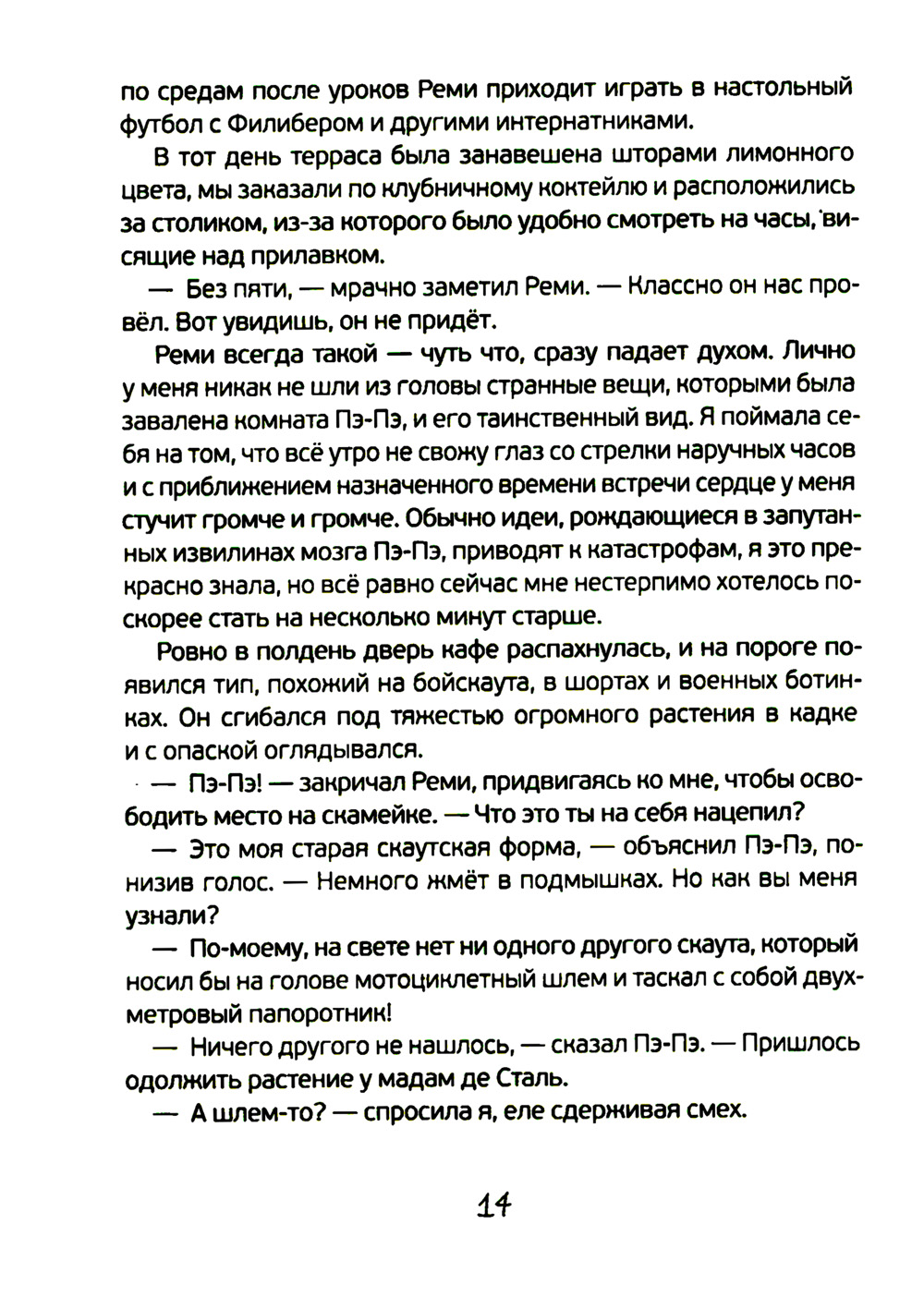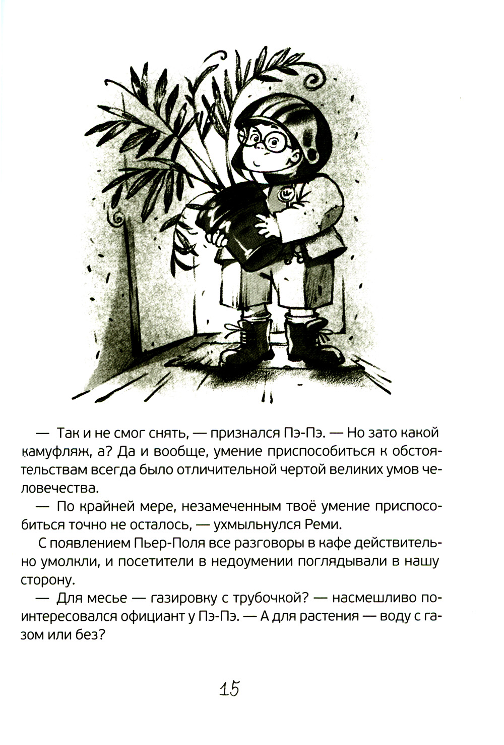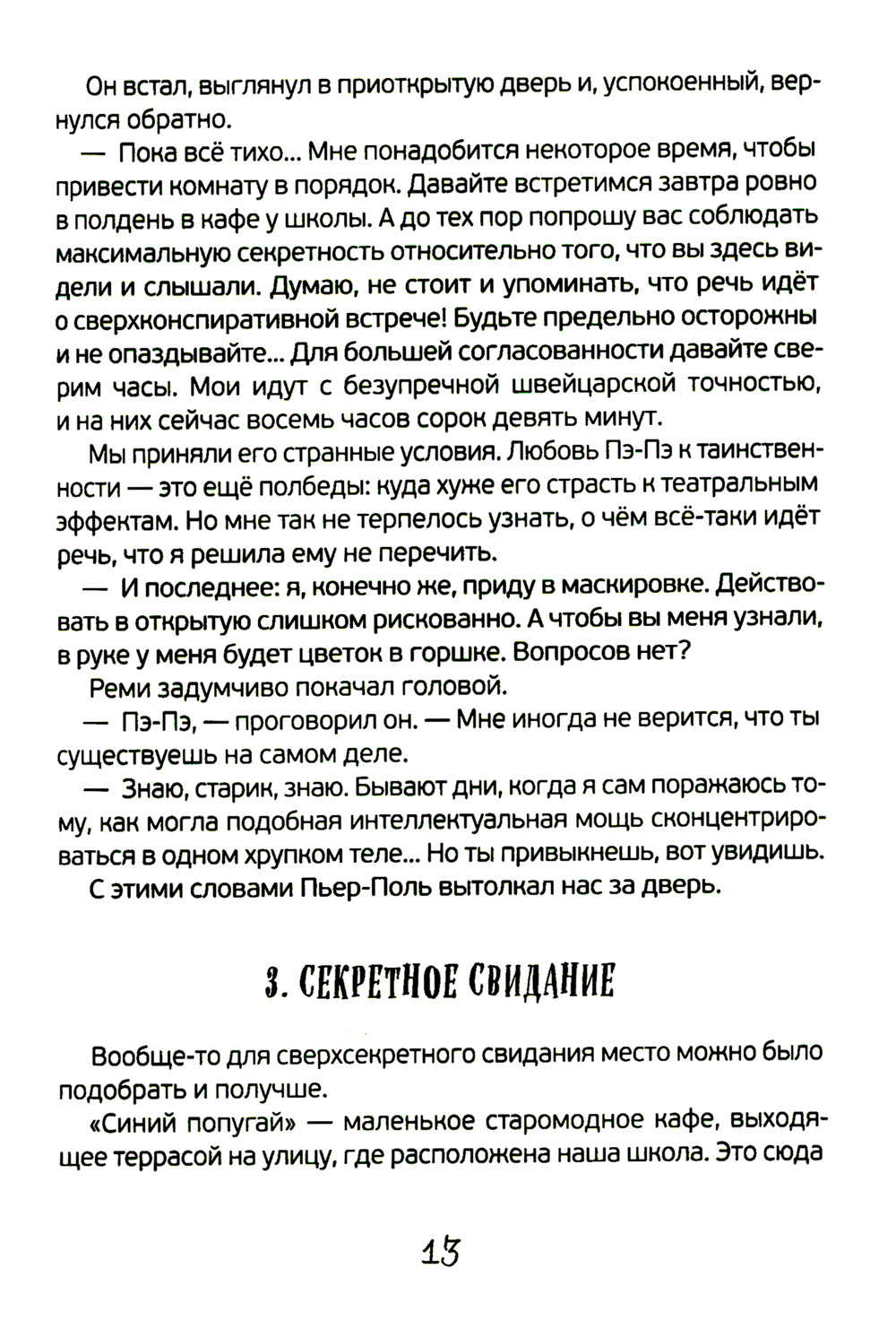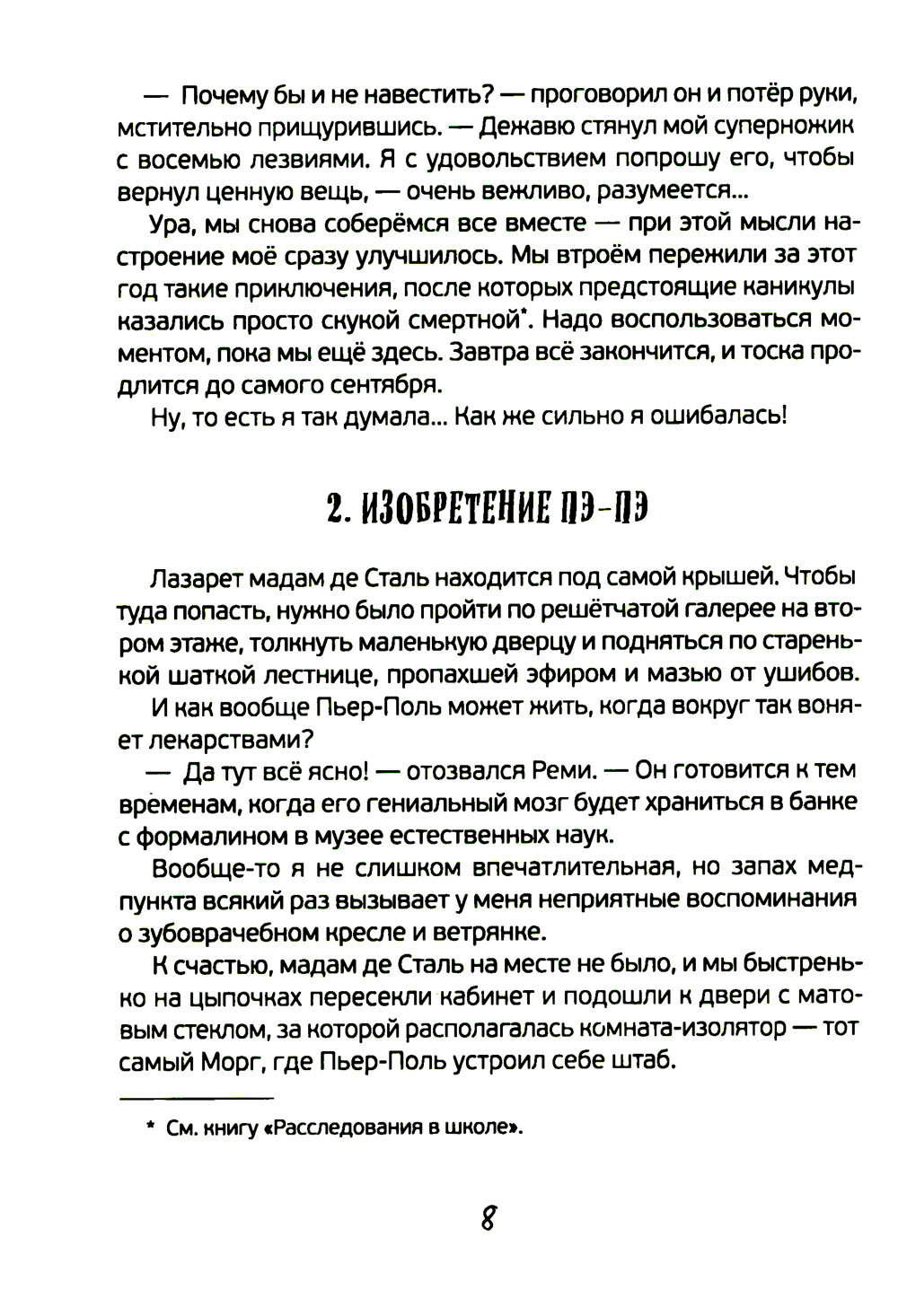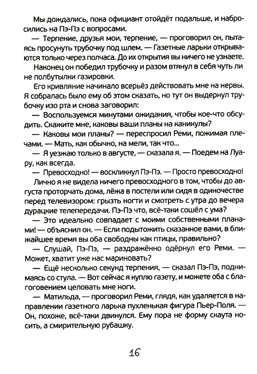 Трое французских школьников снова в деле! Похождения неугомонной троицы, начавшиеся в книге «Расследования в школе», продолжаются. По окончании 7-го класса Пьер-Поль Дежавю, интеллектуал и любитель поесть, уговаривает своих друзей - стеснительного, но решительного второгодника Реми Фарамона и умницу Матильду Блондан - принять участие в новых авантюрах. Поэтому они втроём отправляются на поиски таинственной статуэтки в замках Луары, а затем едут в шотландский замок, чтобы помочь исследователю, который специализируется на экзотических существах, и заодно спасти детёныша тиранодона от незавидной судьбы. А в финальной истории Реми и Матильду подстерегают опасности, пока они выполняют обязанности телохранителей Пьер-Поля на конкурсе изобретений... Найдут ли они загадочную статуэтку? Какие тайны скрывают стены шотландского замка Кийс? И какой экстраординарный объект изобрёл гениальный Пьер-Поль для конкурса? Новая книга Жана-Филиппа Арру-Виньо, известного по серии «Приключения семейки из Шербура» и детскому фэнтези «Магнус Миллион и спальня кошмаров», выходивших в «КомпасГиде», увлекает динамичностью повествования, забавными ситуациями, яркими персонажами и прекрасным чувством юмора. Переводчик Ира Филиппова сумела превосходно передать интонации героев и шутки автора, а иллюстратор Катя Варжунтович чудесно отобразила особенности каждого персонажа.| Издательство | ИД КомпасГид |