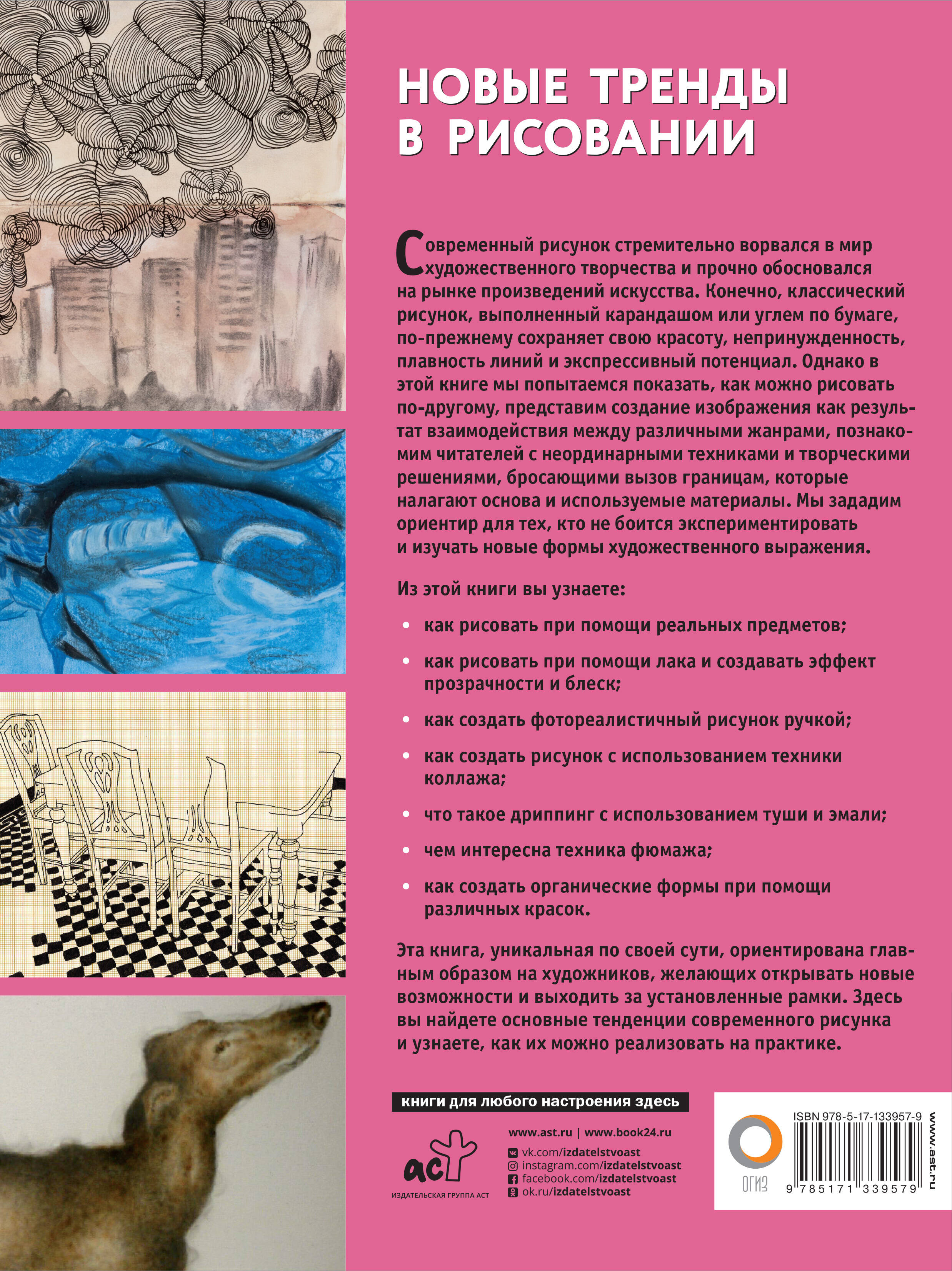 Современный рисунок стремительно ворвался в мир художественного творчества и прочно обосновался на рынке произведений искусства. Конечно, классический рисунок, выполненный карандашом или углем по бумаге, по-прежнему сохраняет свою красоту, непринужденность, плавность линий и свой экспрессивный потенциал. Однако в этой книге мы попытаемся показать, как можно рисовать по-другому, представим создание изображения как результат взаимодействия между различными жанрами, познакомим читателей с неординарными техниками и творческими решениями, бросающими вызов границам, которые налагают основа и используемые материалы. Мы зададим ориентир для тех, кто не боится экспериментировать и изучать новые формы художественного выражения. Эта книга, уникальная по своей сути, ориентирована главным образом на художников, желающих открывать новые возможности и выходить за установленные рамки. Здесь вы найдете основные тенденции современного рисунка и узнаете, как их можно реализовать на практике. Из этой книги вы узнаете • Как рисовать при помощи реальных предметов • Как рисовать при помощи лака и создавать эффект прозрачности и блеск • Как создать фотореалистичный рисунок ручкой • Как создать рисунок с использованием техники коллажа • Что такое дриппинг с использованием туши и эмали • Чем интересна техника фюмажа • Как создать органические формы при помощи различных красок| Издательство | ИЗДАТЕЛЬСТВО "АСТ" |