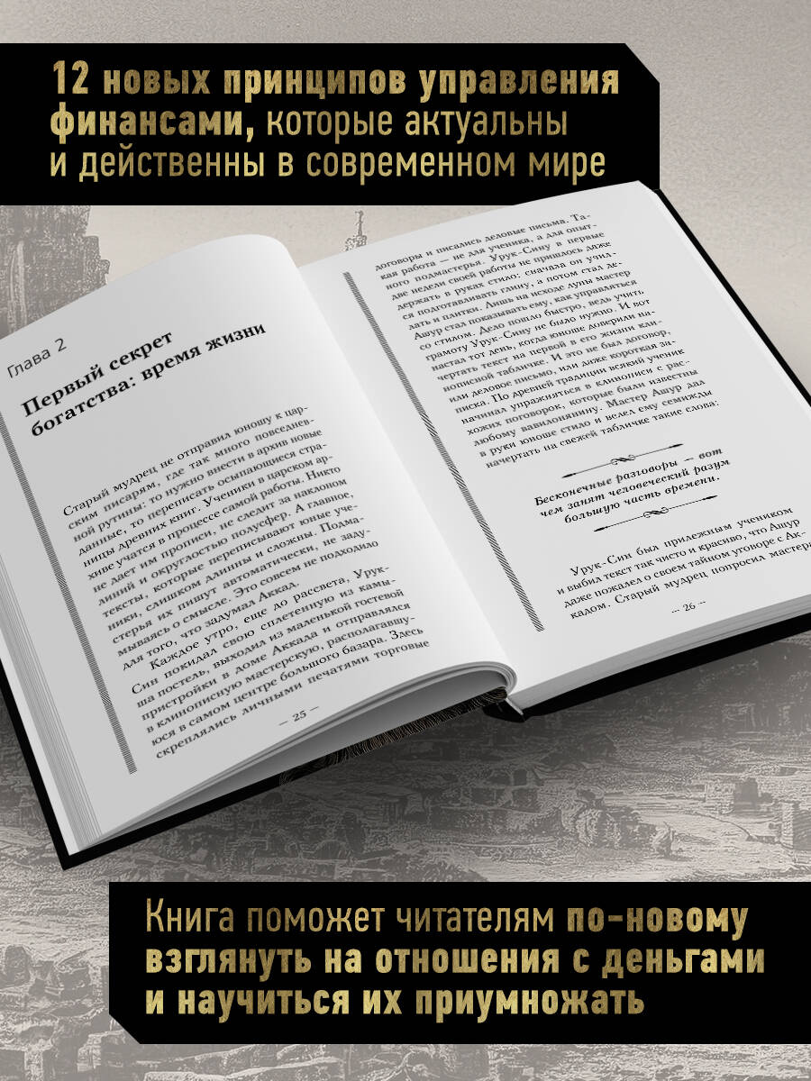 Продолжение легендарного бестселлера "Самый богатый человек в Вавилоне"! В древнем Вавилоне жили талантливые финансисты и торговцы, которые изобрели деньги как средство обмена и векселя. Их мудрость дошла до нас благодаря Дж. С. Клейсону, собравшему знания вавилонян в книгу, покорившую миллионы читателей. Но в его материалах остались истории, которые так и не вошли в основное издание Теперь они раскрыты. Познакомьтесь с Урук-Сином - учеником легендарного Аркада, который знал, как из небольших средств создать прочное состояние, защитить его в трудные времена и приумножить в эпоху перемен. Вы узнаете 12 золотых правил, которые помогут вам обрести финансовую уверенность, чувствовать себя свободно в любых обстоятельствах и построить жизнь, в которой деньги служат вам, а не наоборот. Эта книга подойдет вам, если вы: • мечтаете о финансовой независимости, но не знаете, с чего начать; • хотите научиться эффективно управлять своими деньгами, а не чувствовать себя их заложником; • стремитесь приумножить свой капитал, даже если ваш доход пока скромный; • стремитесь к счастливой, свободной жизни, наполненной достатком. Это ваш шанс начать жизнь без долгов и тревог, уверенно строя свое процветающее будущее, опираясь на уроки, которые выдержали испытание веками.| Издательство | Издательство "АСТ" |