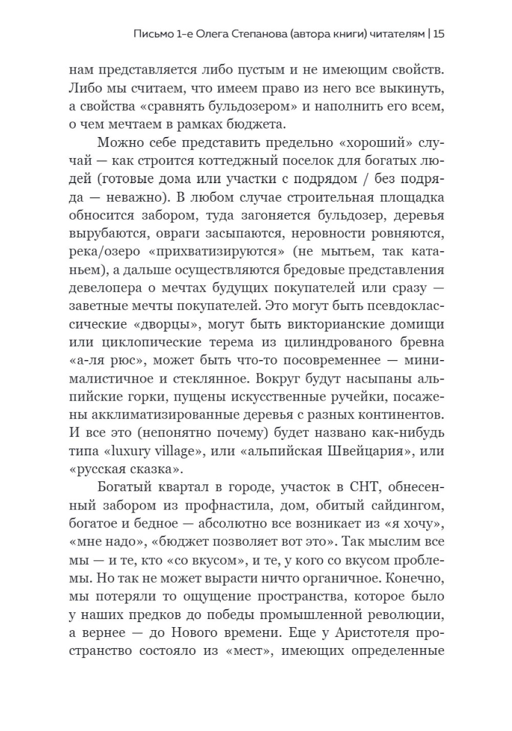 Еще у Аристотеля пространство состояло из «мест», имеющих определенные свойства, а каждая вещь стремилась занять своё «место» в пространстве, тогда вещь становится красива, а между вещами возникает гармония, а значит красота. Уничтожая свойства пространства, мы получаем мёртвую среду, которая не может быть красива и органична. Это фундаментальная проблема. Талантливые архитекторы 20 и 21 века чувствовали эту проблему, писали о ней и пытались ее решить. Авторы книги «Новый элемент расселения - русский проект освоения пространства» вместе с учеными-единомышленниками попытались взглянуть на проблему «города-деревни» по-новому.| Издательство | Изд. НИКЕЯ |