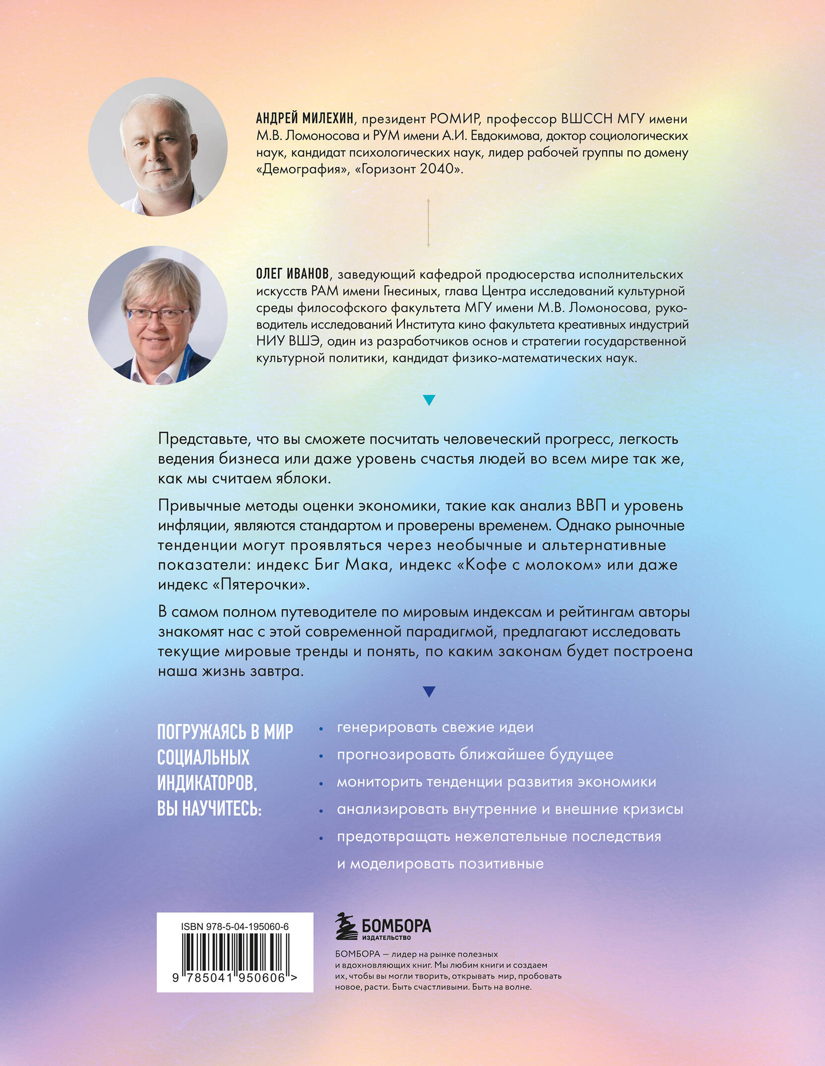 Представьте, что вы сможете посчитать человеческий прогресс, легкость ведения бизнеса или даже уровень счастья людей во всем мире так же, как мы считаем яблоки. Привычные методы оценки экономики, такие как анализ ВВП и уровень инфляции, являются стандартом и проверены временем. Однако рыночные тенденции могут проявляться через необычные и альтернативные показатели: индекс Биг Мака, индекс «Кофе с молоком» или даже индекс «Пятерочки». В самом полном путеводителе по мировым индексам и рейтингам авторы знакомят нас с этой современной парадигмой, предлагают исследовать текущие мировые тренды и понять, по каким законам будет построена наша жизнь завтра. Погружаясь в мир социальных индикаторов, вы научитесь: - генерировать свежие идеи; - прогнозировать ближайшее будущее; - мониторить тенденции развития экономики; - анализировать внутренние и внешние кризисы; - предотвращать нежелательные последствия и моделировать позитивные. Андрей Милёхин - президент РОМИР, профессор ВШССН МГУ имени М.В. Ломоносова и РУМ имени А.И. Евдокимова, доктор социологических, кандидат психологических наук, лидер рабочей группы по домену «Демография», Горизонт 2040. Олег Иванов - заведующий кафедрой продюсерства исполнительских искусств РАМ имени Гнесиных, глава Центра исследований культурной среды философского факультета МГУ имени Ломоносова, руководитель исследований Института кино факультета креативных индустрий НИУ ВШЭ, один из разработчиков Основ и Стратегии государственной культурной политики, кандидат физико-математических наук.