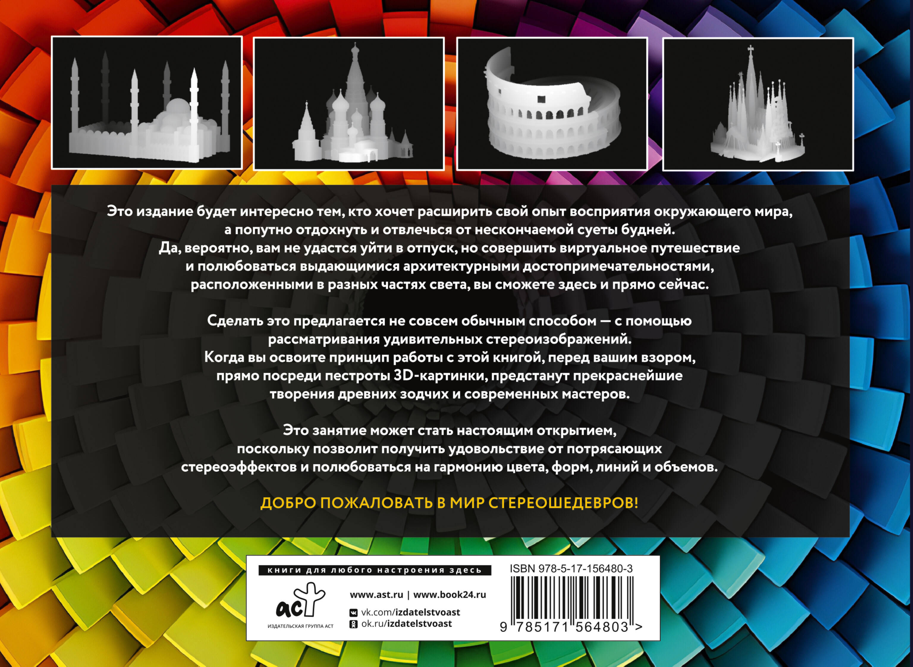 Это издание будет интересно тем, кто хочет расширить свой опыт восприятия окружающего мира, а попутно отдохнуть и отвлечься от нескончаемой суеты будней. Да, вероятно, вам не удастся уйти в отпуск, но совершить виртуальное путешествие и полюбоваться выдающимися архитектурными достопримечательностями, расположенными в разных частях света, вы сможете здесь и прямо сейчас. Сделать это предлагается не совсем обычным способом - с помощью рассматривания удивительных стереоизображений. Когда вы освоите принцип работы с этой книгой, перед вашим взором, прямо посреди пестроты 3D-картинки, предстанут прекраснейшие творения древних зодчих и современных мастеров. Это занятие может стать настоящим открытием, поскольку позволит получить удовольствие от потрясающих стереоэффектов и полюбоваться на гармонию цвета, форм, линий и объемов. Добро пожаловать в мир стереошедевров!