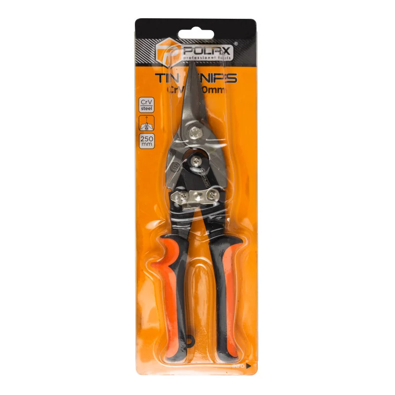 Ножницы по металлу Polax 250 мм прямые Cr-V (25-001) - это незаменимый инструмент, разработанный специально для резки металлических материалов. Предназначены для прямых и фигурных резов с правой и левой стороны с небольшим радиусом. Идеально подходят для обрезки кромок и зачистки заусенцев. Эти ножницы обеспечивают исключительную функциональность и удобство при обработке металла. Ножницы изготовлены из прочной Cr-V стали, что обеспечивает их долгий срок службы и надежность в работе. Длина ножниц 250 мм обеспечивает удобство и точность при резке металлических материалов различных размеров. Встроенный крючок позволяет легко и удобно закрывать лезвия, облегчая рабочий процесс. Эргономичные рукоятки из двухкомпонентного пластика обеспечивают надежный и удобный хват во время работы, снижая усталость рук.