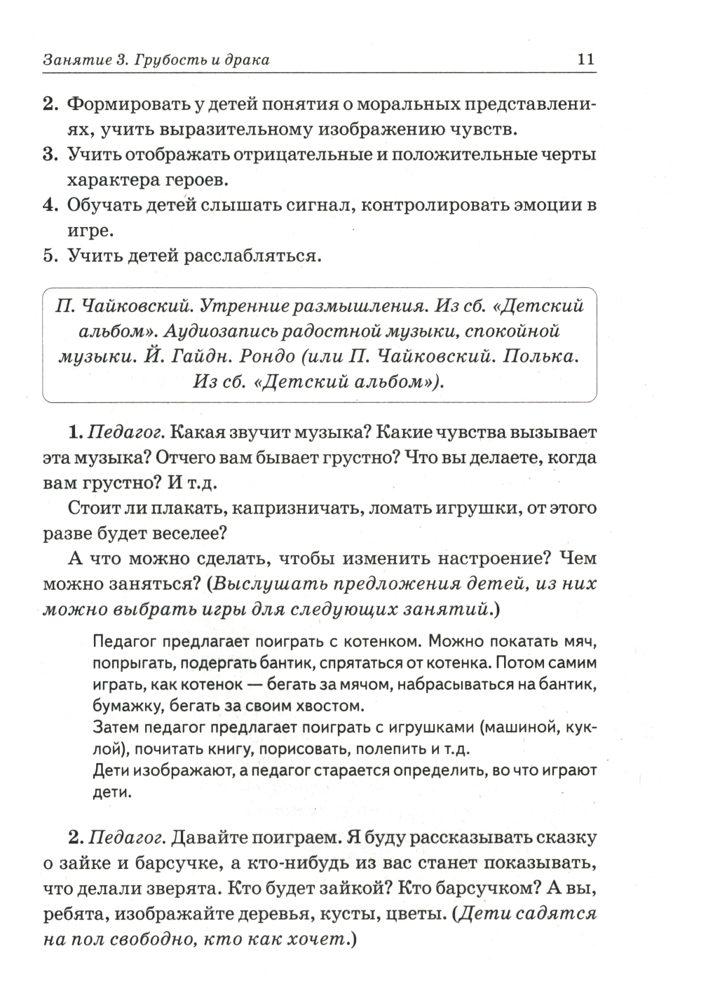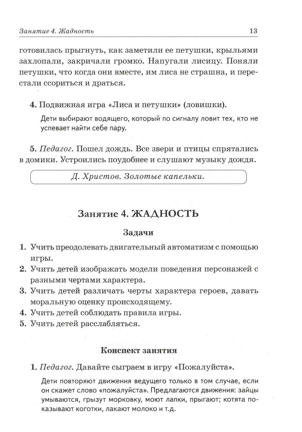 В пособии представлены конспекты 20 занятий для детей среднего и старшего дошкольного возраста (от 4 до 7 лет). Эти занятия представляют собой удачное соединение нравственных бесед с разнообразными играми, психогимнастическими упражнениями и этюдами. Такая подача материала поможет развитию эмоциональной и двигательной сфер, формированию этических представлений у детей. Участие в разыгрывании сюжетов способствует раскрепощению и объединению детей в группы, совершенствованию творческих способностей дошкольников. Занятия проводятся один раз в неделю. Актуальные темы могут отрабатываться в течение двух-трех недель. Пособие адресовано психологам и педагогам дошкольных образовательных учреждений, коррекционно-развивающих центров, руководителям театральных студий и кружков.| Издательство | Гном |