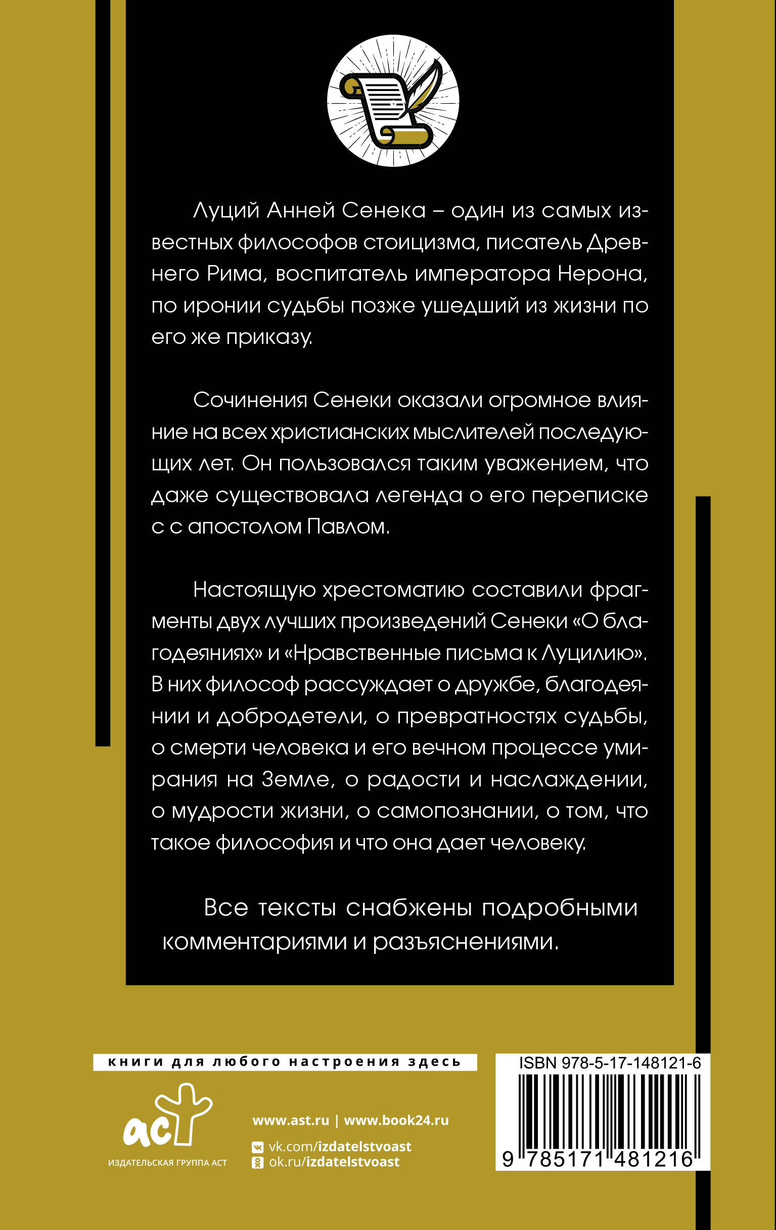 Луций Анней Сенека - один из самых известных римских философов, представитель стоицизма, писатель и воспитатель императора Нерона, по иронии судьбы позже ушедший из жизни по его же приказу. О книге "Нравственные письма к Луцилию": Сочинения Сенеки оказали огромное влияние на всех христианских мыслителей последующих лет. Он пользовался таким уважением, что ему даже приписывали переписку с апостолом Павлом. Настоящую хрестоматию составили фрагменты двух лучших произведений Сенеки "О благодеяниях" и "Нравственные письма к Луцилию". В них философ рассуждает о дружбе, благодеянии и добродетели, о превратностях судьбы, о смерти человека и его вечном процессе умирания на Земле, о радости и наслаждении, о мудрости жизни, о самопознании, о том, что такое философия и что она дает человеку. Издание содержит иллюстрации и комментарии к текстам. Из книги "Нравственные письма к Луцилию" вы узнаете: • В чем суть учения стоицизма; • Как стойко переносить превратности судьбы; • Как стать достойным человеком и гражданином; Для кого эта книга: • Для всех тех, кто любит историю, культуру и философию; • Для студентов исторических и философских факультетов;| Издательство | АСТ |