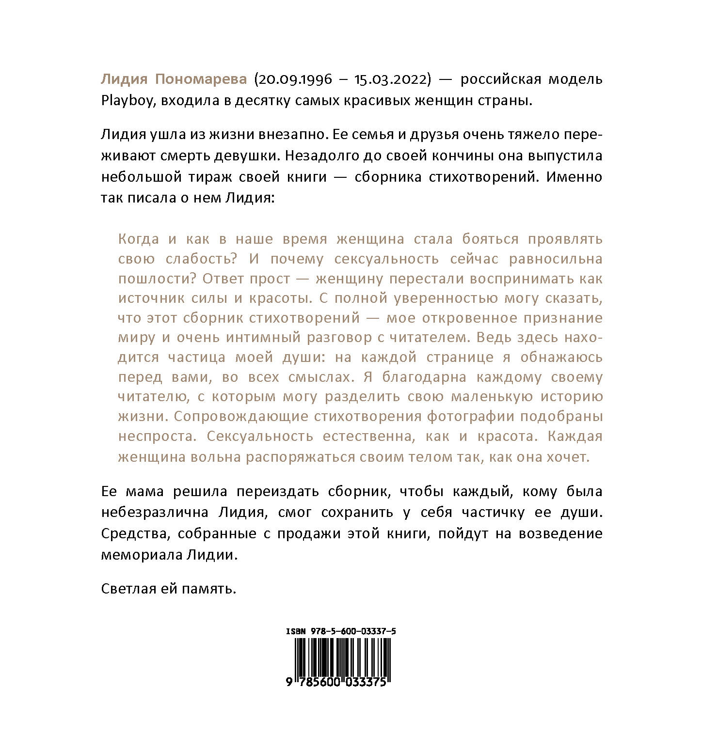Лидия Пономарева (20.09.1996 - 15.03.2022) - российская модель Playboy, входила в десятку самых красивых женщин страны. Лидия ушла из жизни внезапно. Ее семья и друзья очень тяжело переживают смерть девушки. Незадолго до своей кончины она выпустила небольшой тираж своей книги - сборника стихотворений. Именно так писала о нем Лидия: «Когда и как в наше время женщина стала бояться проявлять свою слабость? И почему сексуальность сейчас равносильна пошлости? Ответ прост - женщину перестали воспринимать как источник силы и красоты. С полной уверенностью могу сказать, что этот сборник стихотворений - мое откровенное признание миру и очень интимный разговор с читателем. Ведь здесь находится частица моей души: на каждой странице я обнажаюсь перед вами, во всех смыслах. Я благодарна каждому своему читателю, с которым могу разделить свою маленькую историю жизни. Сопровождающие стихотворения фотографии подобраны неспроста. Сексуальность естественна, как и красота. Каждая женщина вольна распоряжаться своим телом так, как она хочет». Ее мама решила переиздать сборник, чтобы каждый, кому была небезразлична Лидия, смог сохранить у себя частичку ее души. Средства, собранные с продажи этой книги, пойдут на возведение мемориала Лидии. Светлая ей память.| Издательство | Эксмо |