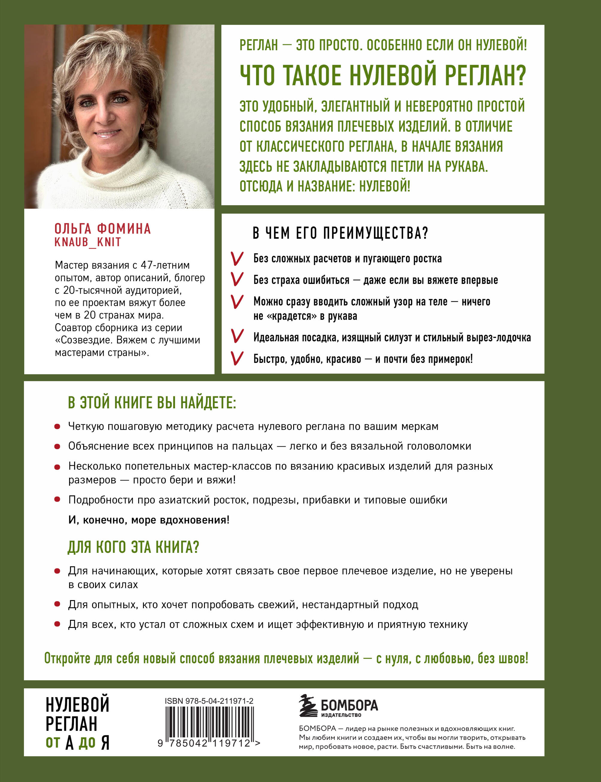 Вязание без стресса - нулевой реглан от А до Я! Нулевой реглан - это не головоломка, а находка! Без сложных расчетов, без пугающего ростка, с отличной посадкой и невероятной свободой в моделировании. Хотите связать стильное плечевое изделие - с красивым вырезом, элегантным силуэтом и минимумом усилий? Эта книга для вас! В книге вы найдете: - Подробное объяснение, что такое нулевой реглан и как он устроен. - Простую систему расчетов по вашим меркам. - Готовые мастер-классы по вязанию авторских изделий с попетельным описанием. - Советы по выбору узоров, ритму прибавок и оформлению подрезов. - Поддержку любимого преподавателя - читайте, вяжите, вдохновляйтесь! Книга необходима всем, кто только начинает вязать и стремится к успеху, опытным мастерам, ищущим новые формы и свободу самовыражения, всем, кто любит уют, эффективность и красивые силуэты! «Связать уютное плечевое изделие под свои мерки проще, чем кажется. Главное - знать, с чего начать. А начать - с нуля!» - Ольга Фомина Нулевой реглан - максимум комфорта, минимум усилий, всегда идеально!| Издательство | ООО "Издательство "Эксмо" |