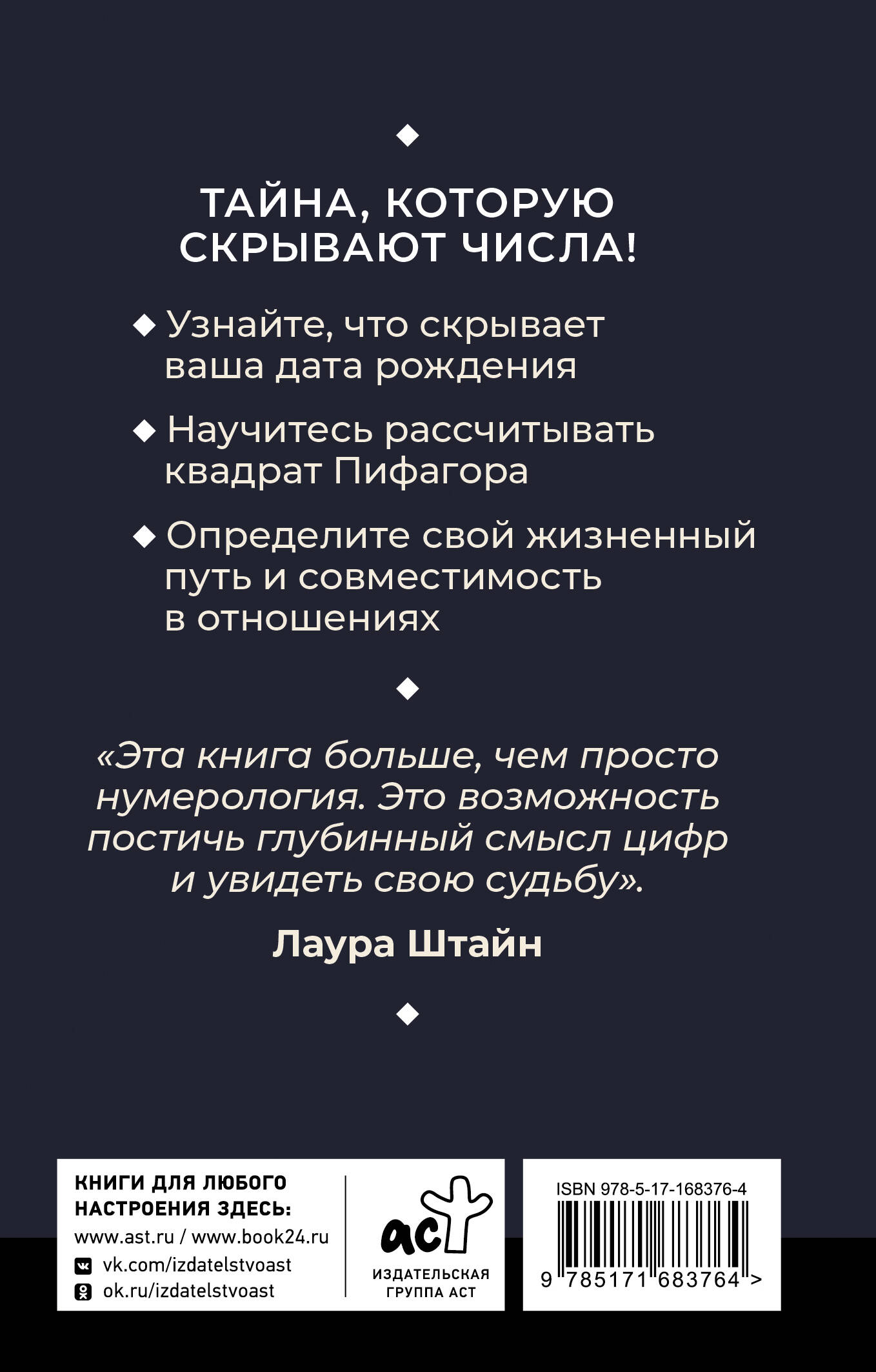 Числа сопровождают нас всю жизнь. Даже ваша дата рождения - не просто набор чисел, а код, содержащий ключ к раскрытию вашего потенциала. В ней заложена информация о сильных и слабых сторонах человека, испытаниях, которые ждут его и предназначении. С этой книгой вы узнаете основы нумерологии - полный курс для тех, кто хочется научиться составлять психоматрицу (квадрат Пифагора), разобрать значения чисел в разных направлениях и применять эти знания для самосовершенствования. Книга содержит множество примеров и практических советов, которые научат вас, как применять нумерологию в жизни. Лаура Штайн - Мастер нумеролог - дает пошаговую методику анализа даты рождения и имени. Книга задумана как пособие для начинающих и подойдет любому человеку, даже если он не силен в расчетах. Издание в небольшом формате удобно брать с собой и изучать в дороге.| Издательство | Издательство "АСТ" |