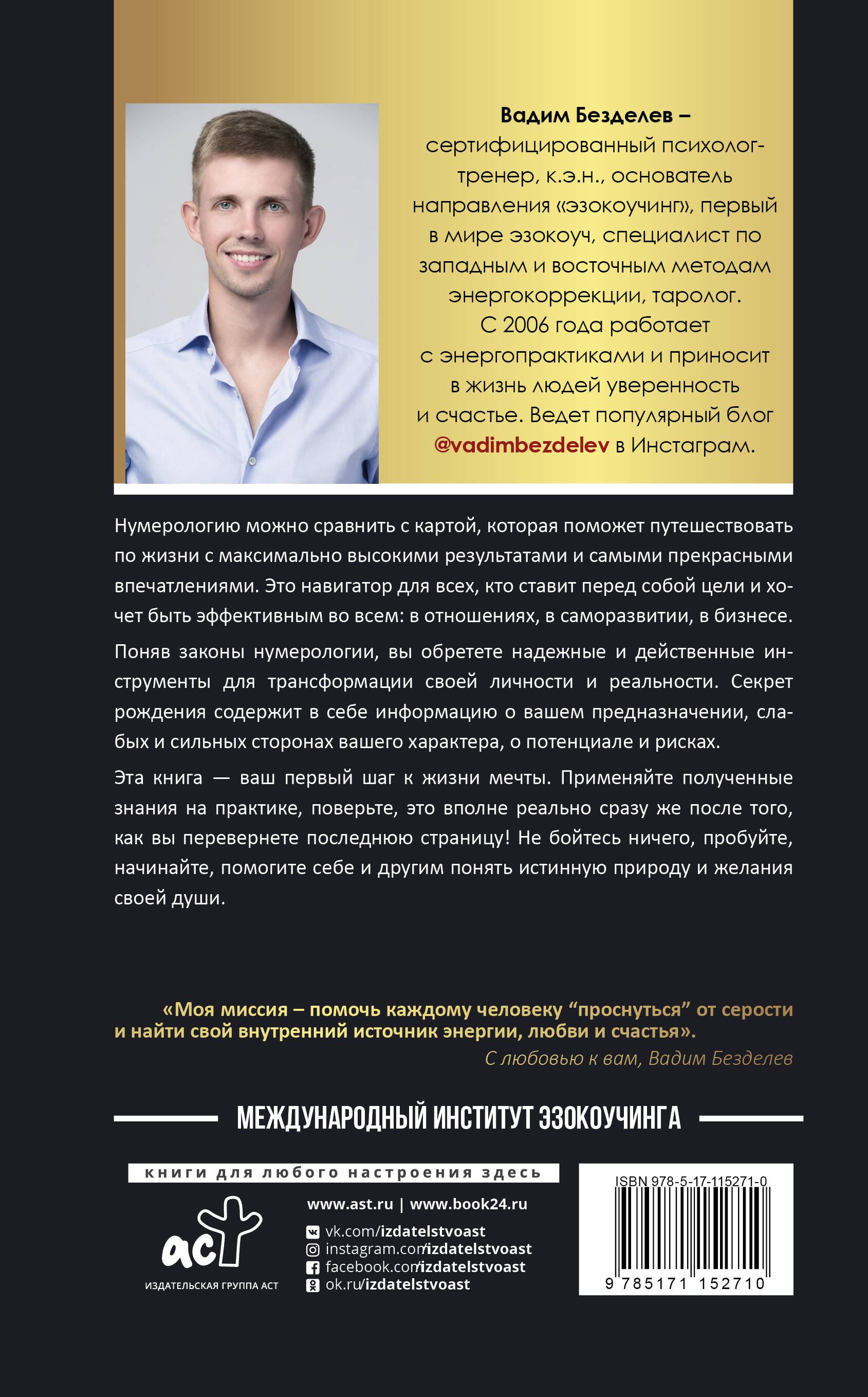 Вадим Безделев - сертифицированный психолог-тренер, к.э.н., основатель направления «эзокоучинг», первый в мире эзокоуч, специалист по западным и восточным методам энергокоррекции, таролог. С 2006 года работает с энергопрактиками и приносит в жизнь людей уверенность и счастье. Ведет популярный блог @vadimbezdelev в Инстаграм.| Издательство | Издательство "АСТ" |