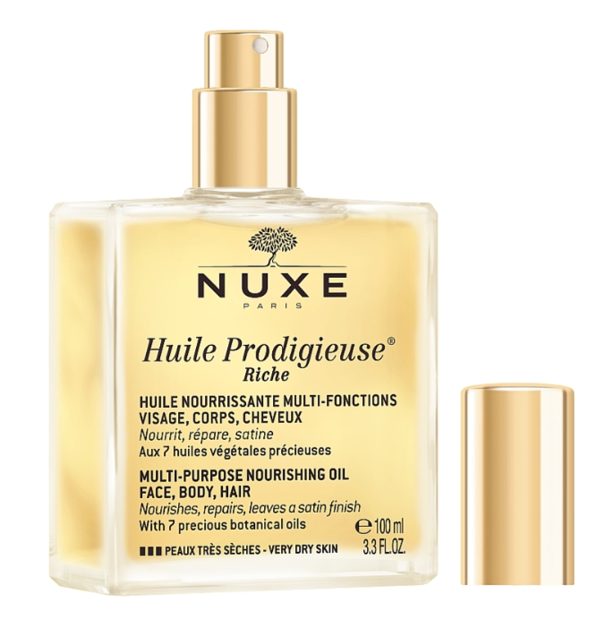 Nuxe Huile Prodigieuse Riche Сухое масло 100 мл - питательное многофункциональное сухое масло для лица, тела и волос. Содержит ценные растительные масла и витамин E, глубоко питает, восстанавливает и смягчает сухую кожу и волосы, оставляя лёгкое сияние без жирного блеска. Идеально для сухой и очень сухой кожи, требующей дополнительного ухода.