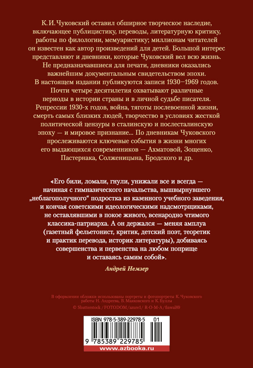 К. И. Чуковский оставил обширное творческое наследие, включающее публицистику, переводы, литературную критику, работы по филологии, мемуаристику; миллионам читателей он известен как автор произведений для детей. Большой интерес представляют и дневники, которые Чуковский вел всю жизнь. В настоящем издании публикуются записи 1930-1969 годов. Почти четыре десятилетия охватывают различные периоды в истории страны и в личной судьбе писателя. Репрессии 1930-х годов, война, тяготы послевоенной жизни, смерть самых близких людей, творчество в условиях жесткой политической цензуры в сталинскую и послесталинскую эпоху - и мировое признание... По дневникам Чуковского прослеживаются ключевые события в жизни многих его выдающихся современников - Ахматовой, Зощенко, Пастернака, Солженицына, Бродского и др.| Издательство | Издательство АЗБУКА ООО |