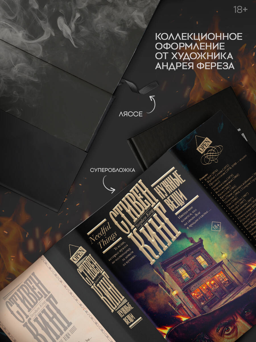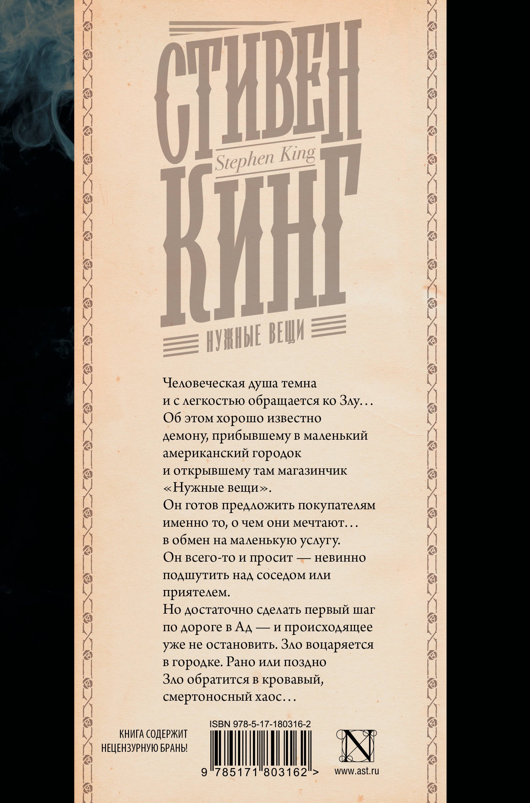 - От автора романов «Сияние»» и «Зеленая миля». - Стивен Кинг - один из самых популярных писателей современности. Он создал свыше семи десятков бестселлеров, которые переведены на 44 языка, изданы в 80 странах мира и разошлись по свету тиражом свыше 400 000 000 экземпляров. - Номинант на премию Брэма Стокера. - «Нужные вещи» - роман, в котором триллер и драма переплетаются с сатирой и панорамой жизни в маленьком американском городке. - Издание в коллекционном оформлении художника Андрея Фереза - суперобложка, ленточка ляссе и белая офсетная бумага.| Издательство | Издательство "АСТ" |