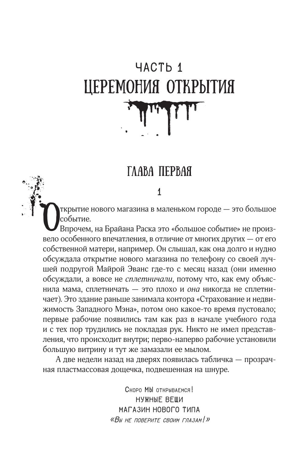Человеческая душа темна и с легкостью обращается ко Злу... Об этом хорошо известно демону, прибывшему в маленький американский городок и открывшему там магазинчик «Нужные вещи». Он готов предложить покупателям именно то, о чем они мечтают... в обмен на маленькую услугу. Он всего-то и просит - невинно подшутить над соседом или приятелем. Но достаточно сделать первый шаг по дороге в Ад - и происходящее уже не остановить. Зло воцаряется в городке. Рано или поздно Зло обратится в кровавый, смертоносный хаос...| Издательство | АСТ |