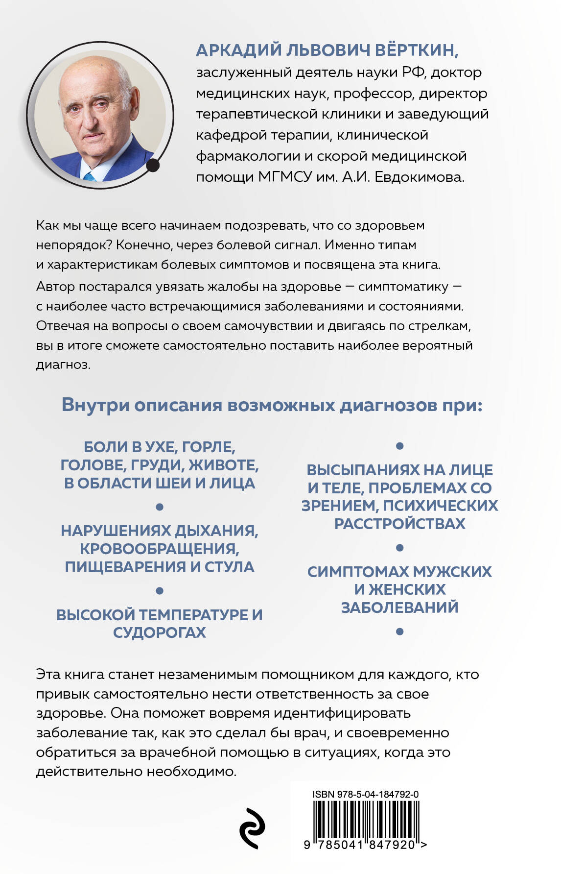 Как мы чаще всего начинаем подозревать, что со здоровьем непорядок? Конечно, через болевой «сигнал». Именно типам и характеристикам болевых симптомов и посвящена эта книга. Авторы постарались увязать жалобы на здоровье (то есть симптоматику) с наиболее часто встречающимися заболеваниями и состояниями. Отвечая на вопросы о своем самочувствии и двигаясь по стрелкам, вы в итоге сможете самостоятельно поставить наиболее вероятный диагноз. - Боли в ухе, горле, голове, груди, животе, на шее и на лице. - Нарушения дыхания, кровообращения, пищеварения и стула. - Высыпания на лице и теле, проблемы со зрением, психические расстройства. - Симптомы мужских и женских заболеваний. - Высокая температура и судороги.| Издательство | ООО "Издательство "Эксмо" |