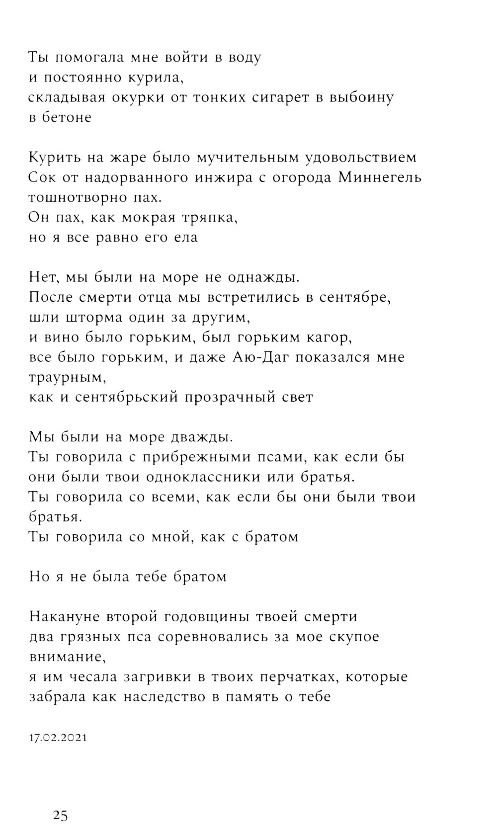 «В этой книге вы увидите рытвины, петли и тупики. Если учишься писать у подлеска - не бойся застревать и плутать». В поэтических циклах, составивших книгу «О чем я думаю», Оксана Васякина продолжает исследовать темные углы памяти, связанные с семейным и личным опытом, телесностью и взрослением. Но на этот раз взгляд писательницы сосредоточен еще и на времени как таковом: путешествуя по «кротовым норам» своей биографии, она методично фиксирует тектонические сдвиги в собственном сознании и окружающей реальности. Особое место в сборнике занимает «Книга Гуро» - поэма-исследование, попытка проникнуть внутрь личного и художественного опыта поэтессы Елены Гуро (1877-1913). Оксана Васякина - писательница, лауреатка премий «Лицей» (2019) и «НОС» (2021).