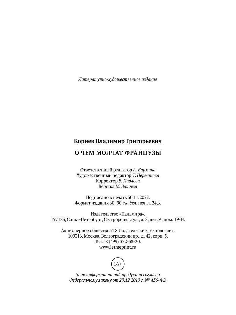Владимир Корнев - известный петербургский прозаик, член Союза писателей Петербурга. Действие в романе-мистерии "О чем молчат французы" (3-е изд., 1995) разворачивается в полном контрастов, переживающем "лихие 90-е" Петербурге, а также в охваченной очистительным пожаром 1812 года и гламурной, ослепляющей неоновой свистопляской миллениума Москве. Герои произведений - заложники круговерти "нечеловеческой" любви и человеческой подлости - в творческом поиске обретают и утверждают самих себя.