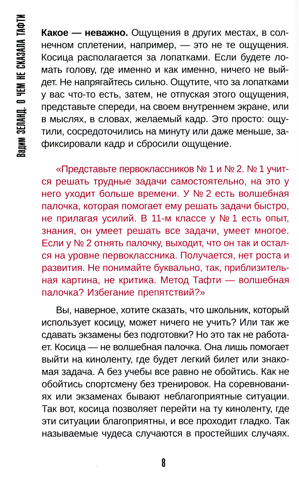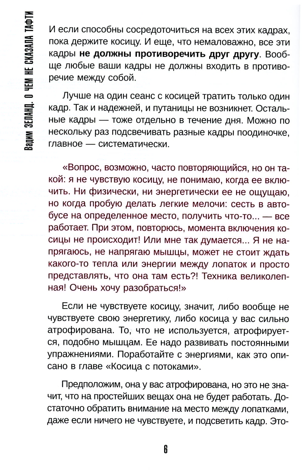 Эта книга посвящена ответам на многочисленные вопросы по книге «Тафти жрица», которая уже стала культовой. Культовой, потому что техники Тафти работают настолько мощно, что буквально ошеломляют читателей. Здесь же даются тому подтверждения - реальные отзывы о Тафти. Например, такой... Мария Евланова Это просто сумасшествие какое-то! Я настолько сильного эффекта не ожидала! Во-первых, книга написана настолько понятно - алгоритмами. Не нужно делать конспекты. Во-вторых, действует намного сильнее. Трансерфинг начал менять жизнь через четыре года, задавание же реальности действует каждый раз в течение дня, и все сильнее. У меня просто уже крышу сносит.| Издательство | ИГ Весь |