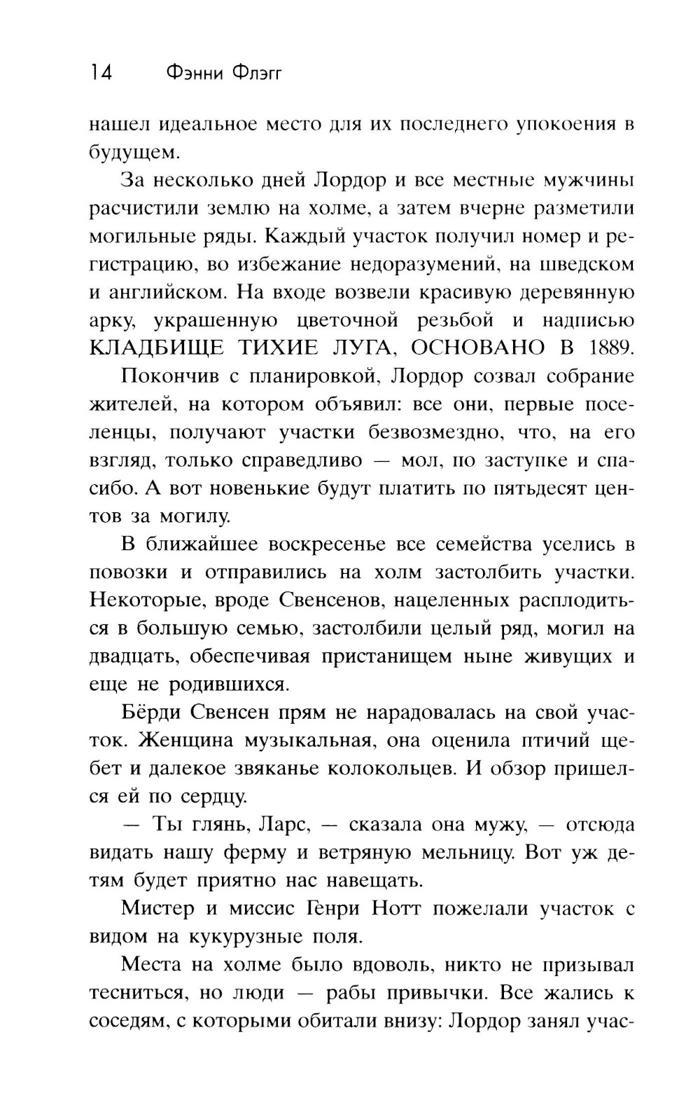 Элмвуд-Спрингс, что в штате Миссури - маленький городок, похожий на сотни уютных американских городков. Но у него есть две особенности. Во-первых, его придумала Фэнни Флэгг, и это целая вселенная персонажей, раскиданных по разным романам писательницы, ставших уже литературной классикой. А во-вторых, при городке есть кладбище, на котором происходит нечто странное и удивительное... В 1889-м году молодой швед, перебравшийся в Америку, заложил первую ферму, через пару десятков лет вокруг его дома разрослась уютная деревушка с милыми и работящими жителями. С годами деревушка превратилась в городок. Элмвуд-Спрингс рос, хорошел, в нем рождались и умирали люди, и у каждого была своя особенная история. Великолепная рассказчица Фэнни Флэгг сотворила целый мир, населенный обычными людьми, но столь уютный и обаятельный, что каждому читающему ее книги рано или поздно начинает хотеться перебраться в него. Новый роман можно назвать путеводителем по творчеству Фэнни Флэгг, в нем собрались герои из многих ее книг - от «Жареных зеленых помидоров» до «На бензоколонке только девушки». Это подарок для всех, кто согласен с сентенцией Фэнни: «жизнь - это дар, а любовь бессмертна».| Издательство | Фантом Пресс |