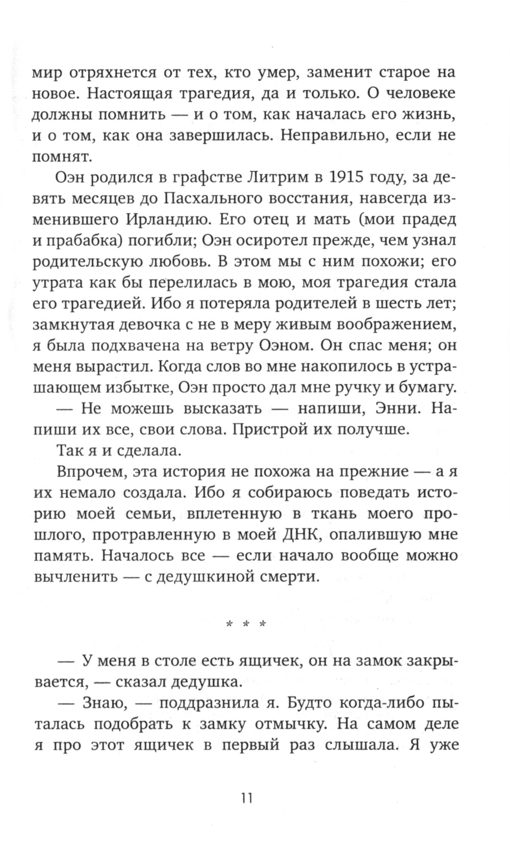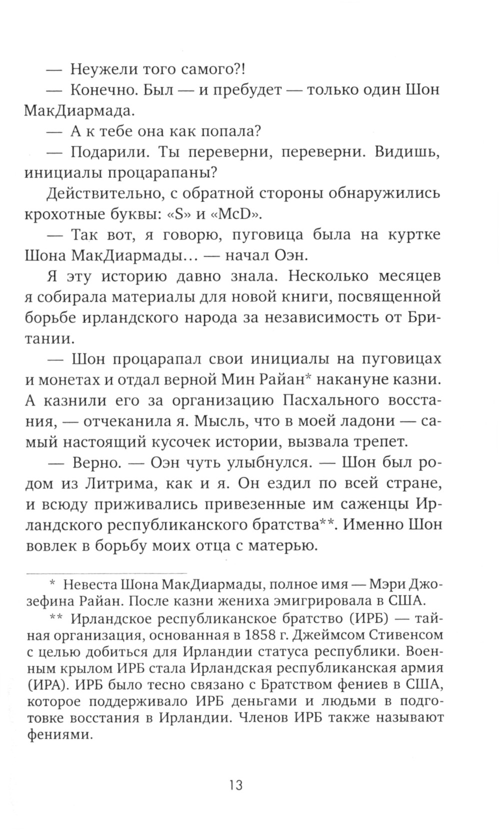Писательница Энн Галлахер с детства зачарована Ирландией и гордится своими ирландскими корнями. Молодая американка приезжает в Ирландию в надежде узнать историю собственной семьи, которая таит множество загадок и тесно переплетена с самыми трагичными страницами ирландской революции. Поиски подробностей приводят Энн к невероятному перемещению во времени. Энн попадает в 1921 год и оказывается в эпицентре борьбы за независимость Ирландии. Доктор Томас Смит, спасший ей жизнь, принимает Энн за шпионку. Однако противиться влечению к таинственной гостье Томасу не по силам. И любовь его взаимна. Энн оказывается вовлечена в политическую борьбу, исход которой ей известен наперед. Энн не вправе влиять на течение исторических событий, но может ли она изменить историю своей семьи ради великого чувства?| Издательство | Клевер-Медиа-Групп |