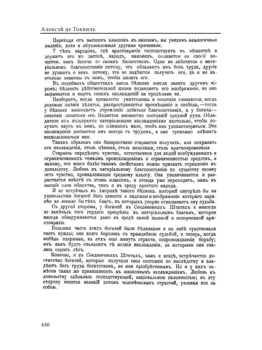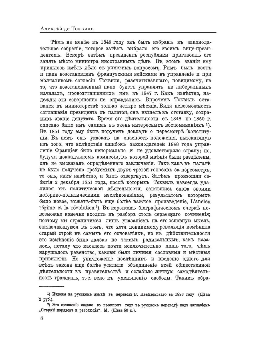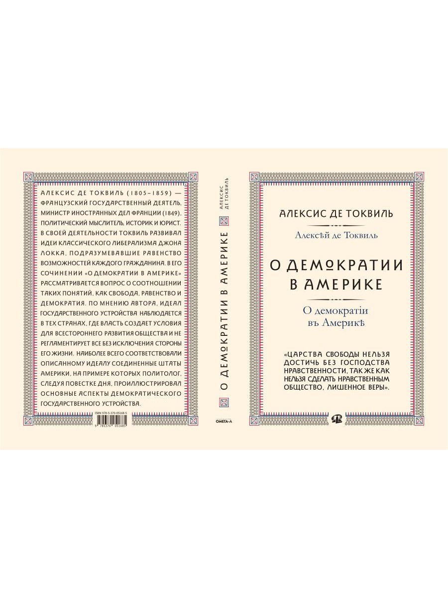 Алексис де Токвиль (1805-1859) - французский государственный деятель, министр иностранных дел Франции (1849), политический мыслитель, историк и юрист. В своей деятельности Токвиль развивал идеи классического либерализма Джона Локка, подразумевавшие равенство возможностей каждого гражданина. В его сочинении "О демократии в Америке" рассматривается вопрос о соотношении таких понятий, как свобода, равенство и демократия. По мнению автора, идеал государственного устройства наблюдается в тех странах, где власть создает условия для всестороннего развития общества и не регламентирует все без исключения стороны его жизни. Наиболее всего соответствовали описанному идеалу Соединенные Штаты Америки, на примере которых политолог, следуя повестке дня, проиллюстрировал основные аспекты демократического государственного устройства. Воспроизведено по изданию магазина "Книжное Дело", Москва, 1897 г.