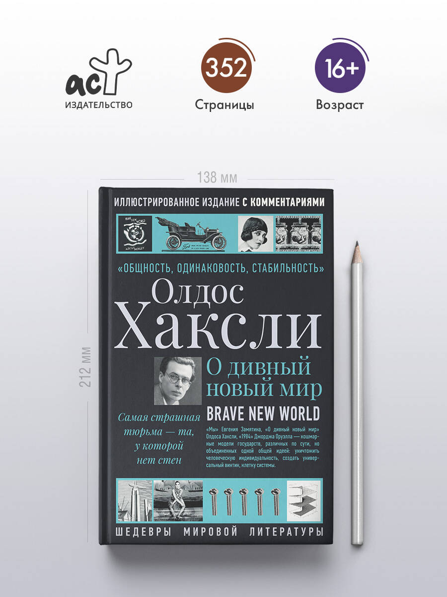 Олдос Хаксли вырос в семье, принадлежавшей к британской культурной элите. Он обладал поразительной эрудицией, свободно говорил на французском и немецком, был знаком с философами и известными писателями того времени. Его роман полон скрытых цитат, аллюзий, отсылок, насмешек над реальными людьми, писателями, политиками и бизнесменами, философскими течениями и мечтами о справедливом обществе. Все эти насмешки зашифрованы в тексте, и обнаружить их без подсказок - непростая задача. Большинство не заметит их, а значит, потеряет половину удовольствия от чтения романа. Эта книга дает читателю ключ к расшифровке "Дивного нового мира". Практически все имена и фамилии в романе - "говорящие", а их сочетание - оригинальный сатирический прием автора. Не случайно выбраны и географические названия, а цитат из Шекспира в тексте - более сорока. И не только цитаты - в романе фактически зашифрована вся пьеса Шекспира "Буря". Не к одному Шекспиру обращается Хаксли. Томас Элиот, Томас Грей, Дэвид Лоуренс и Бертран Рассел - вот неполный список авторов, имена которых упоминаются в комментариях. А еще Хаксли использует открытия ученых и их прогнозы для создания синтетической картины будущего, которая кажется пугающе убедительной. В начале XX века, когда все приходили в восторг от грядущих даров технического прогресса, Олдос Хаксли увидел девушек-сборщиц, работающих на конвейере, и ужаснулся. И предложил своим читателям оглянуться вокруг и задать себе вопрос: как много они готовы отдать за сомнительные дары технического прогресса. А еще приглядеться внимательнее и увидеть стены невидимой тюрьмы, которые они раньше не замечали. "Ведь ничто не дается даром", - утверждал Олдос Хаксли.| Издательство | Издательство "АСТ" |