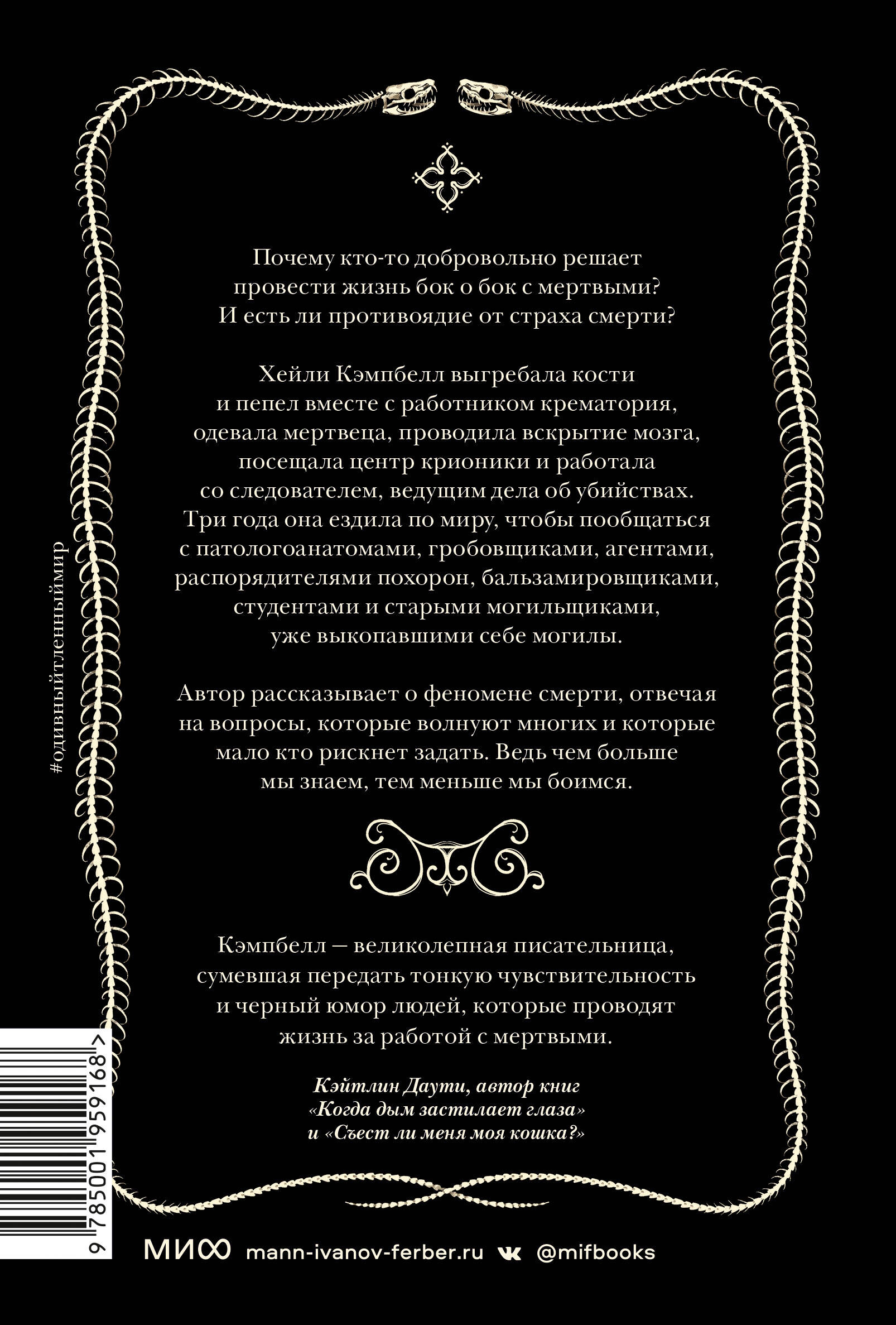 Книга о том, почему кто-то выбирает жизнь, в которой ежедневно присутствуют мертвые? И есть ли противоядие от страха смерти? Хэйли Кэмпбелл три года ездила по миру, чтобы пообщаться с людьми, чьи профессии связаны со смертью: с патологоанатомами, гробовщиками, агентами, распорядителями похорон, бальзамировщиками, студентами и старыми могильщиками, уже выкопавшими себе могилы. Она выгребала кости и пепел с работником крематория, одевала мертвеца, проводила вскрытие мозга, посещала центр крионики в Мичигане и работала с детективом по расследованию убийств. Зачем? Чтобы написать о феномене смерти и ответить на волнующие многих вопросы, которые неудобно задавать. Продолжение темы книги "Съест ли меня моя кошка?" и рекомендация ее автора Кейтлин Даути. Перевод с английского Василия Горохова. Научный консультант - Сергей Шигеев, д. м. н., профессор, главный специалист по судебно-медицинской экспертизе Москвы и ЦФО РФ. От автора: Смерть, а также те, кто сделал работу с умершими своей профессией, начали увлекать меня много лет назад, и этот интерес нитью проходит сквозь мою жизнь. Они ежедневно смотрят в лицо той правде, которую я могла лишь вообразить. Чудовище, которое прячется в соседнем вентиляционном люке, и про которое не говорят ничего существенно и конкретного, всегда кажется особенно жутким, поэтому я решила узнать, как выглядит обыденная человеческая - не птичья и не кошачья - смерть не на фотографиях и не в кино. Но чем больше я беседовала, тем больше вопросов задавали мне самой. Что ты хочешь найти здесь, где тебе быть необязательно? Зачем терзать саму себя этой темой? Я считала себя неуязвимой. Это оказалось не так. Я была права: мне действительно чего-то не хватало. Однако я наивно недооценивала глубину раны и степень влияния нашего отношения к смерти на повседневность - то, насколько оно мешает не только понимать, но и скорбеть в момент, когда все рушится. Я увидела наконец реальность смерти и почти не могу выразить словами, насколько это меня преобразило. Но там, во тьме, я нашла нечто большее. Это как часы аквалангиста и звезды на потолке детской комнаты: свечение становится заметно в темноте. Для кого эта книга: Для тех, кто хочет узнать о смерти, как она выглядит и как ее принять. Для всех, кому страшно интересно.| Издательство | МАНН, ИВАНОВ И ФЕРБЕР ООО |