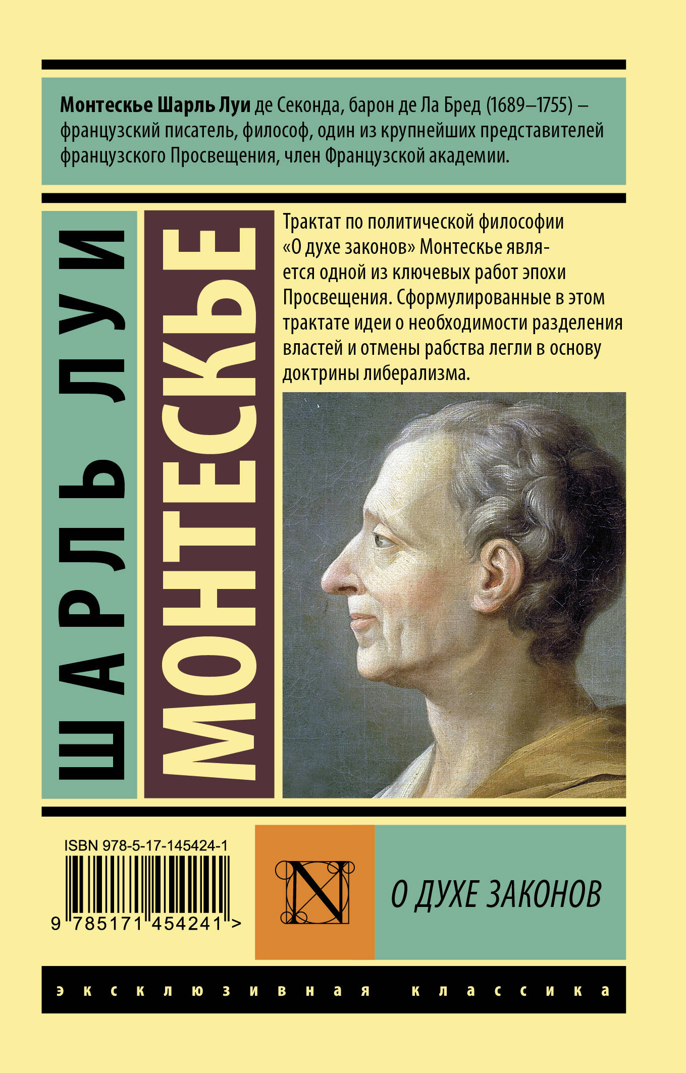 Монтескье Шарль Луи де Секонда, барон де Ла Бред (1689-1755) - французский писатель, философ, один из крупнейших представителей французского Просвещения, член Французской академии. Трактат по политической философии "О духе законов" Монтескье является одной из ключевых работ эпохи Просвещения. Сформулированные в этом трактате идеи о необходимости разделения властей и отмены рабства легли в основу доктрины либерализма.| Издательство | ИЗДАТЕЛЬСТВО "АСТ" |