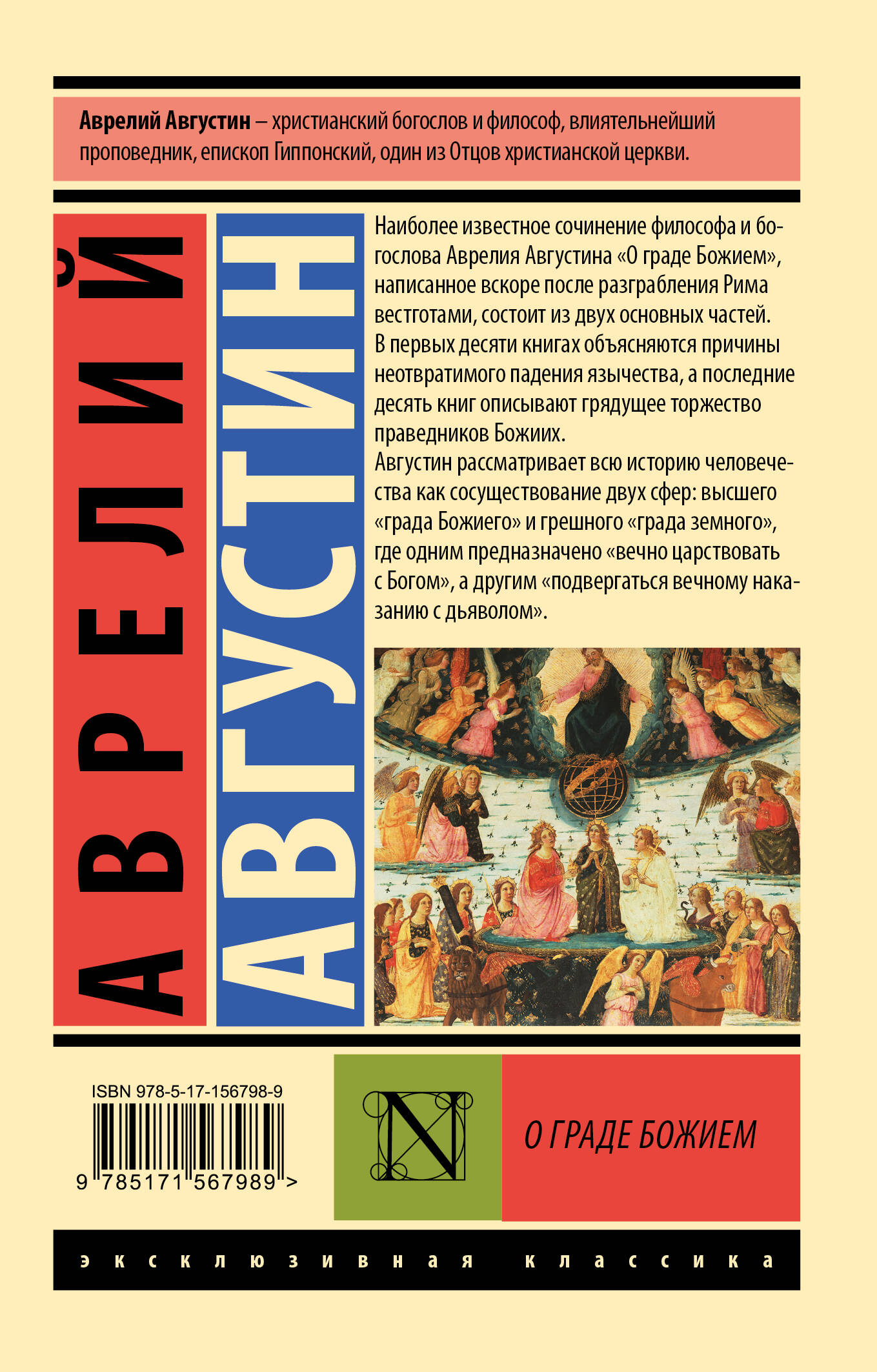 Аврелий Августин - христианский богослов и философ, влиятельнейший проповедник, епископ Гиппонский, один из Отцов христианской церкви. Наиболее известное сочинение философа и богослова Аврелия Августина "О граде Божием", написанное вскоре после разграбления Рима вестготами, состоит из двух основных частей. В первых десяти книгах объясняются причины неотвратимого падения язычества, а последние десять книг описывают грядущее торжество праведников Божиих. Августин рассматривает всю историю человечества как сосуществование двух сфер: высшего "града Божиего" и грешного "града земного", где одним предназначено "вечно царствовать с Богом", а другим "подвергаться вечному наказанию с дьяволом".