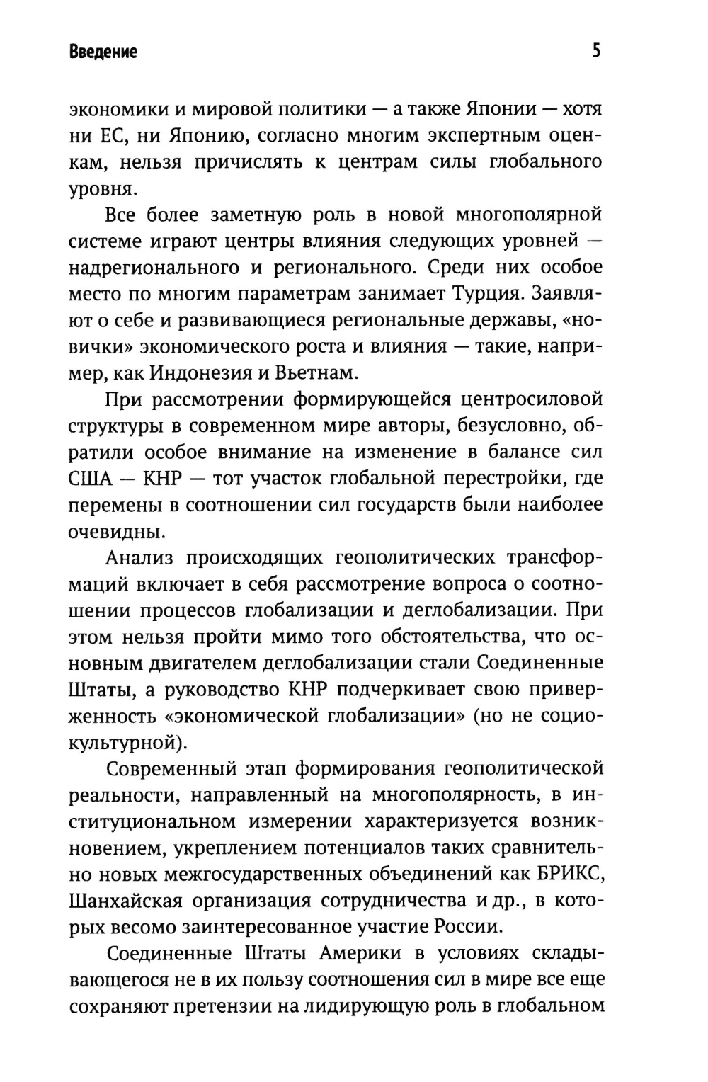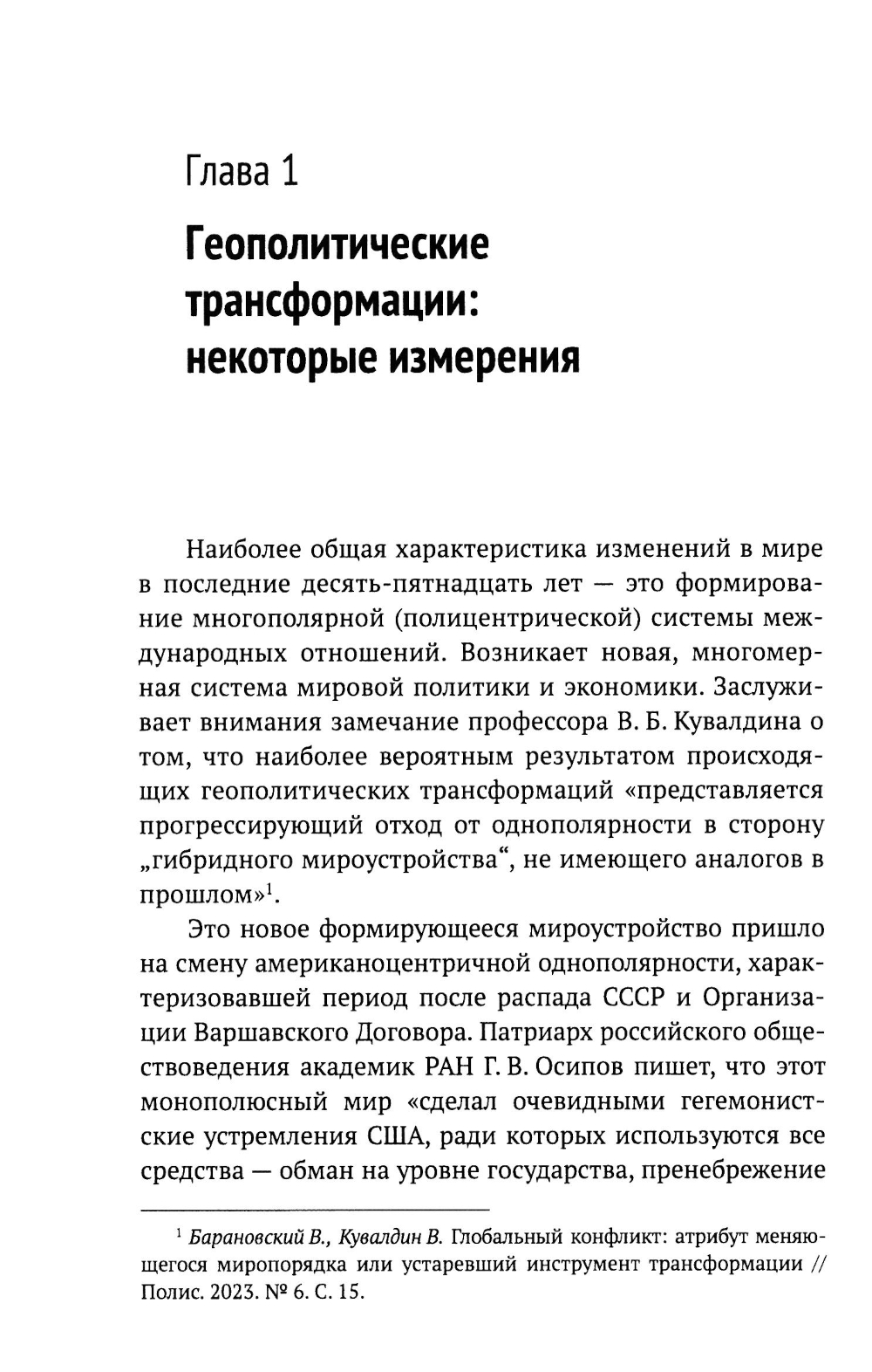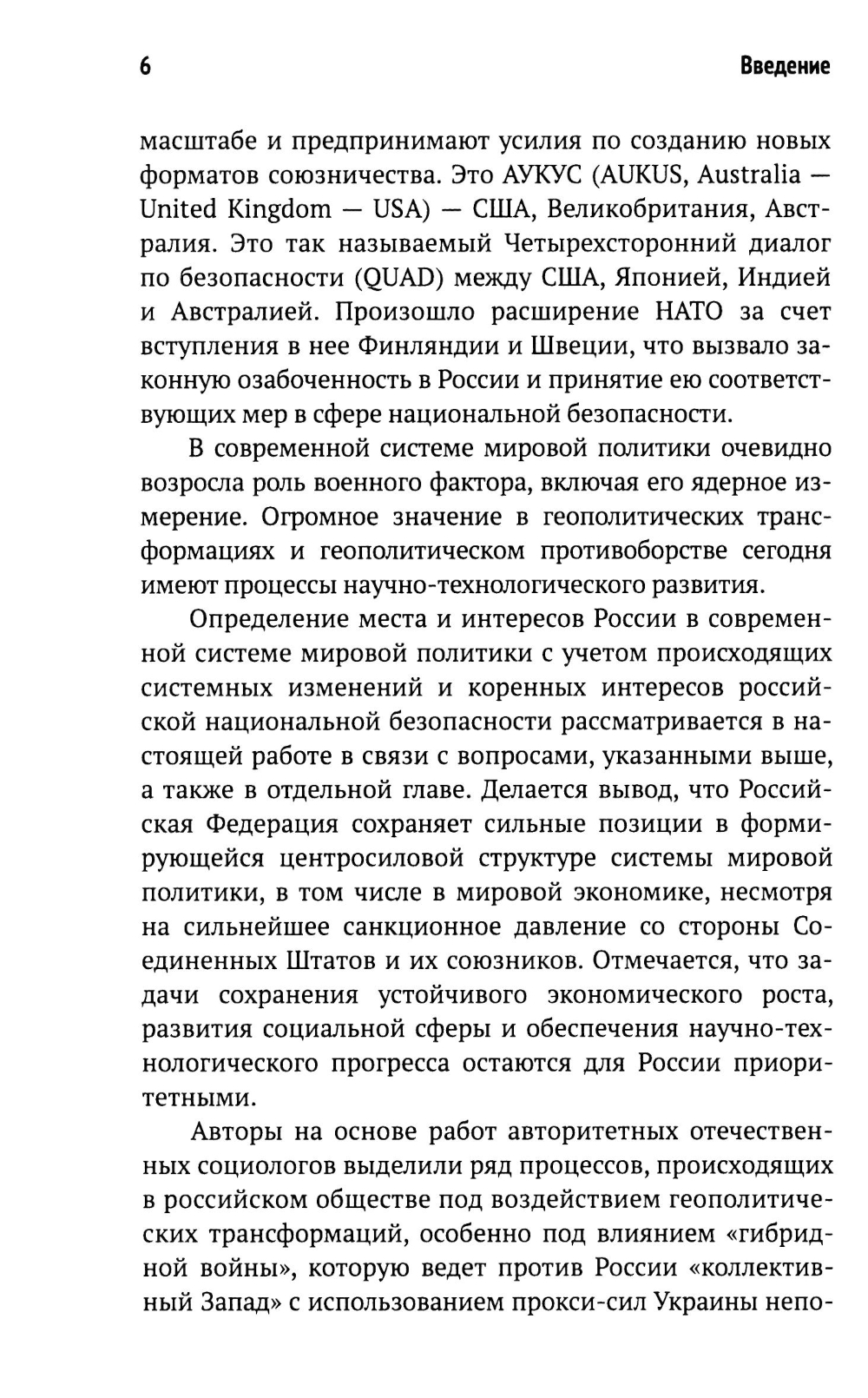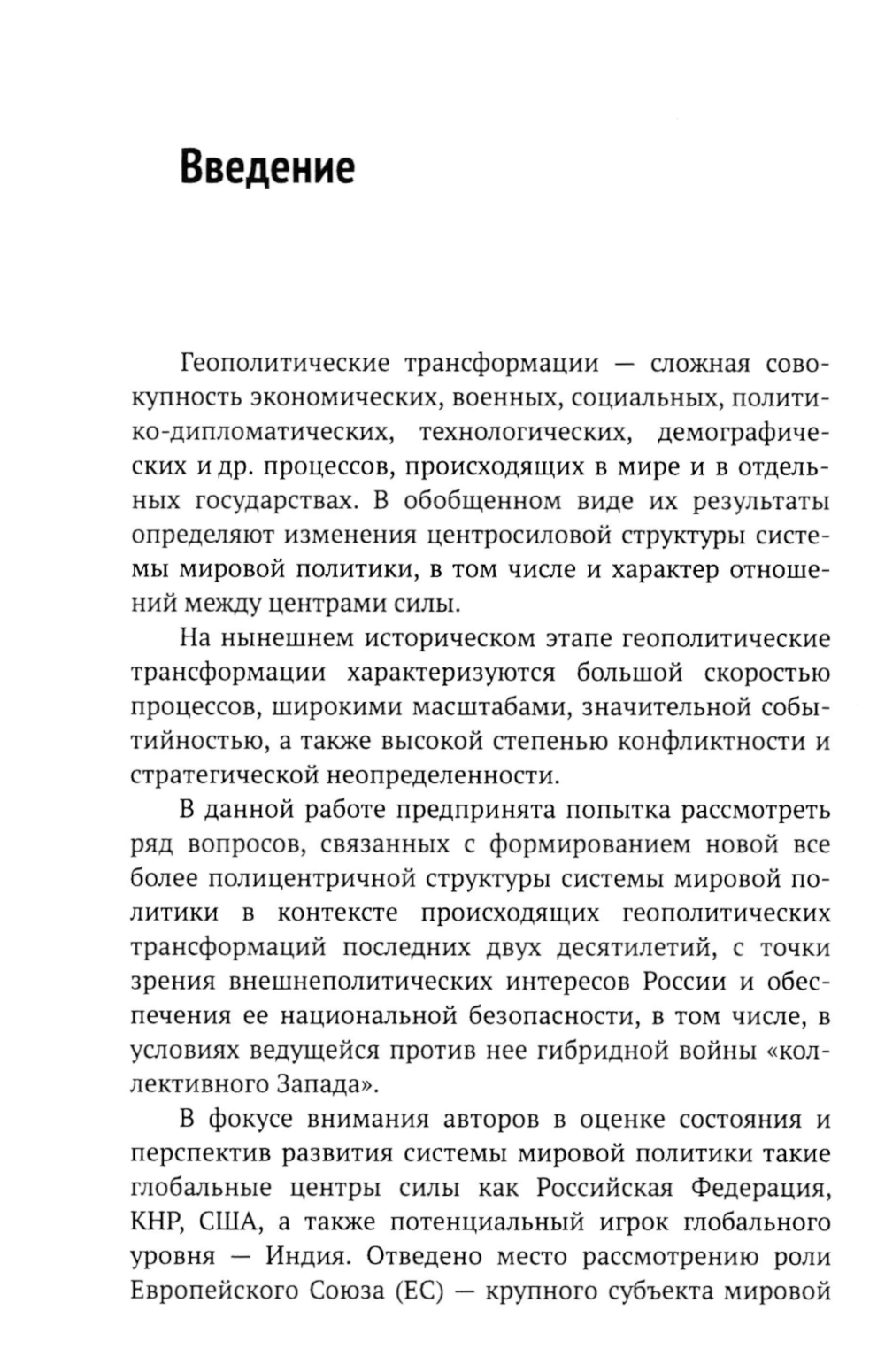 В работе рассмотрены факторы и параметры современных геополитических трансформаций - этой сложной и меняющейся совокупности различных процессов, отражающейся прежде всего в изменении центросиловой структуры системы мировой политики. Проанализирована роль мировых центров силы - РФ, КНР, США, а также потенциального глобального игрока - Индии. Оценено место в мировой геополитике Европейского союза и Японии. Показано региональное и надрегиональное влияние Турции, возрастающее влияние региональных держав на примере Вьетнама и Индонезии. Обсуждено значение научно-технологического, военного факторов в геополитических трансформациях, показаны изменения в состоянии межгосударственных альянсов и объединений. Проанализировано место и интересы России в современной системе мировой политики, в том числе применительно к внутреннему социально-экономическому и социально-политическому развитию, формированию социальной реальности страны. Определены процессы, происходящие в российском обществе под воздействием геополитических трансформаций, особенно под влиянием «гибридной войны», которую ведет против РФ «коллективный Запад». Подчеркивается, что в этих условиях в России произошла консолидация общества, усилилась поддержка следования РФ собственным путем с опорой на традиционные российские ценности.