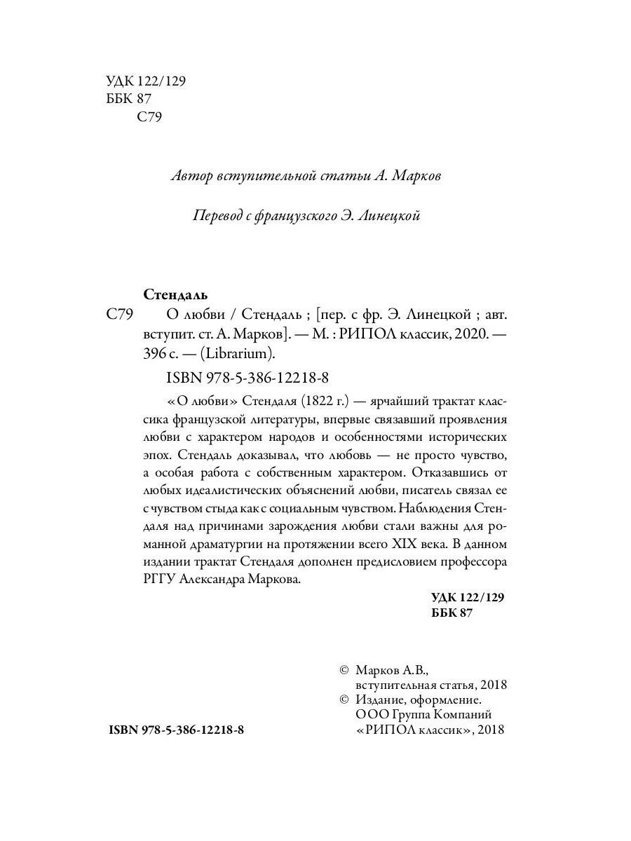 «О любви» Стендаля (1822 г.) - ярчайший трактат классика французской литературы, впервые связавший проявления любви с характером народов и особенностями исторических эпох. Стендаль доказывал, что любовь - не просто чувство, а особая работа с собственным характером. Отказавшись от любых идеалистических объяснений любви, писатель связал ее с чувством стыда как с социальным чувством. Наблюдения Стендаля над причинами зарождения любви стали важны для романной драматургии на протяжении всего XIX века. В данном издании трактат Стендаля дополнен предисловием профессора РГГУ Александра Маркова.| Издательство | Рипол Классик |