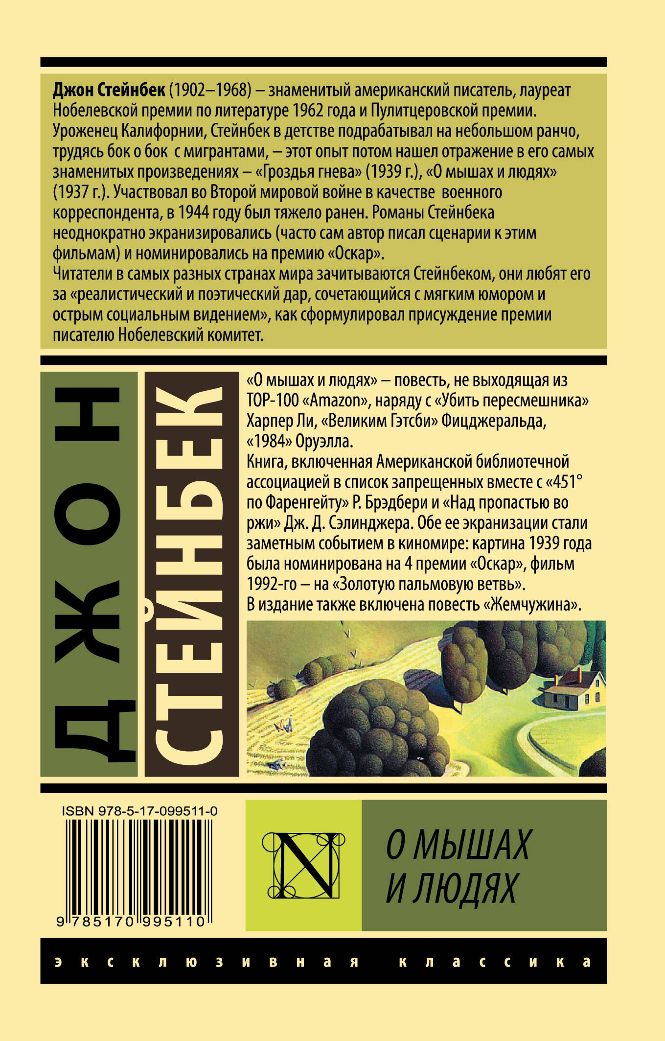"О мышах и людях" - повесть, не выходящая из ТОР-100 "Amazon", наряду с "Убить пересмешника" Харпер Ли, "Великим Гэтсби" Фицджеральда, "1984" Оруэлла. Книга, включенная Американской библиотечной ассоциацией в список запрещенных вместе с "451° по Фаренгейту" Р. Брэдбери "Над пропастью во ржи" Дж.Д. Сэлинджера. Обе ее экранизации стали заметным событием в киномире: картина 1939 года была номинирована на 4 премии "Оскар", фильм 1992-го - на "Золотую пальмовую ветвь". В издание также включена повесть "Жемчужина".| Издательство | АСТ |